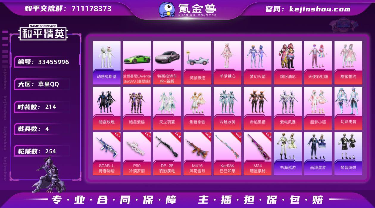 苹果 手Q-15粉装-11特效枪-4载具-9粉色飞行器-92016热力值-14王牌印记-214套装-254枪皮 【热门品类】:粉装-梦幻火箭,粉装-缤纷油彩,套装-动感兔斯基人偶服,套装-粉红小猪 【粉色套装】:粉装-天使彩虹糖,粉装-梦幻火箭,粉装-缤纷油彩,粉装-甜蜜誓约,粉装-暗夜玫瑰,粉装-暗星紫秘,粉装-天之羽翼,粉装-焦糖拿铁,粉装-冷魅冰骑,粉装-赤焰黑爵,粉装-紫电风暴,粉装-甜梦小狐,粉装-幻彩电音,角色-羊梦糖心,角色-霁蓝缠春 【粉色枪皮等级】:SCAR-L-青春物语(七级),SCAR-L-灵驹仙姬(三级),M416-风花雪月(五级),AKS-74U-森灵之息(五级),P90-冷漠罗丽(七级),Kar98K-巳巳如意(五级),M24-暗星紫秘(五级),Mk14-福马献瑞(一级),M249-霁蓝缠春(五级),DP-28-豹影疾电(五级),PKM-萌骑夺宝(四级) 【粉色载具】:特斯拉Roadster(沁心粉),兰博基尼Aventador SVJ(翡翠绿),灵鼠银迹,九霄玄鹿 【粉色枪皮】:SCAR-L-青春物语,SCAR-L-灵驹仙姬,M416-风花雪月,AKS-74U-森灵之息,P90-冷漠罗丽,Kar98K-巳巳如意,M24-暗星紫秘,Mk14-福马献瑞,M249-霁蓝缠春,DP-28-豹影疾电,PKM-萌骑夺宝 【粉色飞行器】:炫彩糖果飞行器,阿狸红飞行器,天之羽翼飞行器,甜...