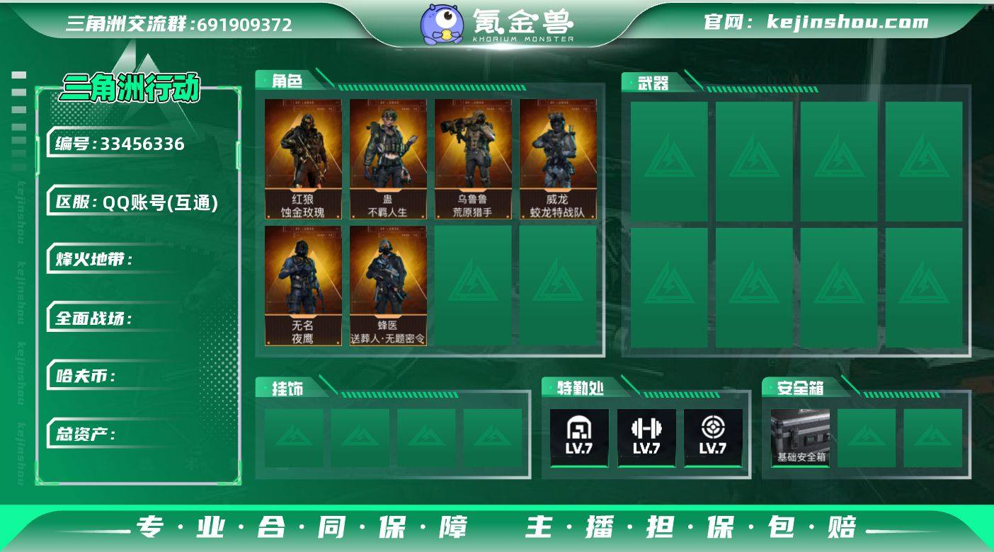 三角洲稀有蛟龙号:【干员皮肤:红狼-蚀金玫瑰/威龙-蛟龙特战队/无名-夜鹰/蜂医-无题密令/女医-不羁人生/乌鲁鲁-荒原猎手】【仓库六套+满改枪】【咖啡豆+航天油等大红】【10发AW+大量金蛋】【总资产100M/现币1200W】【烽火60级/仓库7/满体满负】