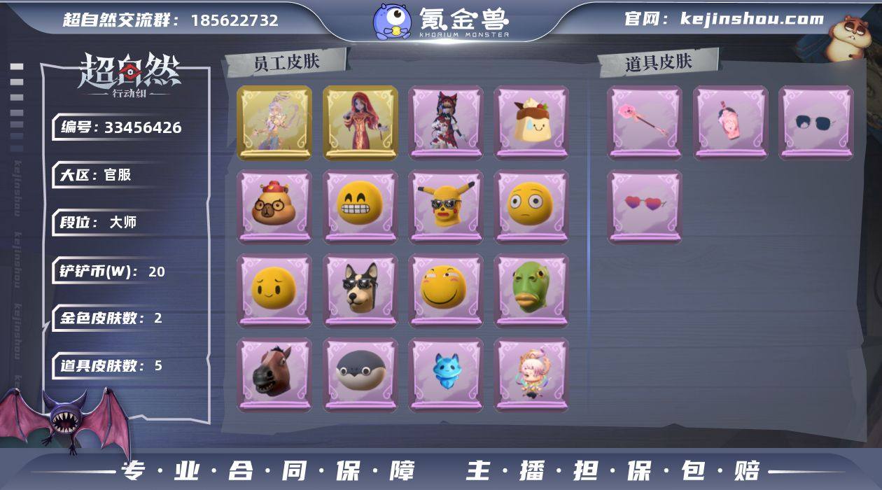 金色皮肤数量: 2 紫色皮肤数量: 1 道具皮肤数量: 5 段位: 大师 员工: 薇薇安,小黄,零,爱丽丝,爱德华,兰 外观: 镜花辞,嘻嘻头套,烈焰红唇头套,呆滞头套,卑微头套,哈士奇头套,滑稽头套,鱼头怪头套,面具马头套,萨卡班甲鱼头套,小财神豚豚头套,梵音莲华,莲华渡,莓果陷阱,潮汐小海兔,樱桃奶油布丁