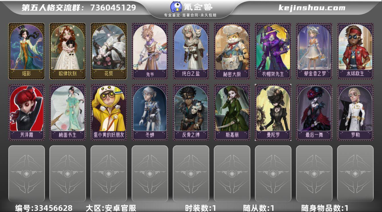官服182时装4金23紫12随从29随身物品 ✅【XQR0125】 ✅区服:安卓邮箱号✅登入方式:邮箱号✅5.14可换绑 ✅金皮数量:4✅热门金:花祭,瑶彩,欧律狄刻,片刻闲暇 ✅紫皮数量:23✅热门紫:芳泽霞,秘密大厨,斯嘉丽,蛋小黄的好朋友,兔爷,水球救生,桃面书生,纯白之盐,最后一舞,罗勒,冬馋,曼陀罗,反骨之缚,衣帽架先生,郁金香之梦