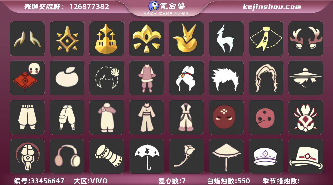 账号类型: 手机账号 季节已毕业: 预言季,梦想季,小王子季,集结季,九色鹿季,织光季 完成地图: 晨岛,云野,雨林,霞谷,暮土,禁阁 珍稀物品: 阿努比斯(狗头),玫瑰花 礼包: 围巾,鹿角,福娃,橘子,贝壳,新年裤 裤子: 武士裤,背带裤,搓澡巾,王子服,飞天裤 面具: 阿努比斯,凤凰面具,裂纹面具,贴花面具 面饰: 红耳机 发型: 若笠,虚荣,小王子发型,飞天盘发 头饰: 行军锅头盔,平顶帽 斗篷: 黄色蓑衣,蟑螂斗,黄色连帽披风 配饰: 雨伞,小红伞,玫瑰花,圆鼓 亮点: 【优质装备】:预言季,阿努比斯(狗头),武士裤,梦想季,小王子季(王子季),行军锅头盔(六边锅帽子)(双耳锅帽子),集结季,玫瑰花,小红伞(姆明红伞)(姆明大伞),九色鹿(九色鹿季),王子服(小王子套装),飞天裤(柔缎花边连)(九色鹿丝带裤),蟑螂斗(凤凰斗篷),凤凰面具,贴花面具(丛林黑面具),小王子发型,黄色连帽披风(连帽斗篷)(斜边队长斗篷),圆鼓(手拍大鼓),飞天盘发(九色鹿丸子头),福娃(福娃礼包)(春之日礼包)(铜钱斗),红耳机,围巾(小王子斗篷)(小王子围巾),鹿角(圣诞鹿角),新年裤(瑞气服饰),晨岛,云野,雨林,霞谷,墓土(暮土),禁阁,若笠(箬笠),橘子(大橘大利),贝壳(贝壳发饰)