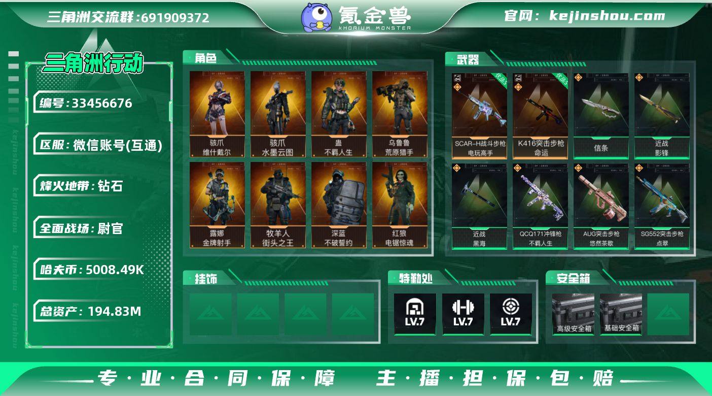 实名: 可修改 烽火地带段位: 钻石 全面战场段位: 尉官 总资产: 194830208 哈夫币: 5008499 干员外观: 威龙-铁面判官(S1),牧羊人-街头之王(S2),威龙-壮志凌云(S3),骇爪-水墨云图,无名-夜鹰(S4),蜂医-送葬人·无题密令(S5),深蓝-不破誓约(S6),骇爪-维什戴尔,红狼-电锯惊魂,露娜-金牌射手(S7),乌鲁鲁-荒原猎手,蛊-不羁人生 传说武器皮肤: QBZ95-1突击步枪-破军,M7战斗步枪-维京,M7战斗步枪-神秘艺术,P90冲锋枪-神秘艺术,SCAR-H战斗步枪-铁艺苍穹,近战-影锋,M1014霰弹枪-影锋,AWM狙击步枪-影锋,SR-25射手步枪-水墨云图,SCAR-H战斗步枪-水墨云图,AS Val突击步枪-蛇年祥瑞,CAR-15突击步枪-黑鹰坠落,QJB201轻机枪-黑海,MP5冲锋枪-黑海,近战-黑海,AK-12突击步枪-夜鹰,SMG45冲锋枪-骑士,725双管霰弹枪-送葬人-无题密令,M4A1突击步枪-阿米娅,CAR-15突击步枪-阿米娅,Vector冲锋枪-狩猎时刻,G3战斗步枪-狩猎时刻,M16A4突击步枪-狩猎时刻,AK-12突击步枪-特斯拉线圈,SR-3M紧凑突击步枪-特斯拉线圈,UZI冲锋枪-特斯拉线圈,勇士冲锋枪-能天使-午夜邮差,R93狙击步枪-维什戴尔,SCAR-H战斗步枪-启航,ASh-12战斗步枪-鹅鸭杀,QCQ171冲锋枪-鹅鸭杀,QJB201轻机枪-鹅鸭杀,K437突击步枪-几何解构,G3战斗步...