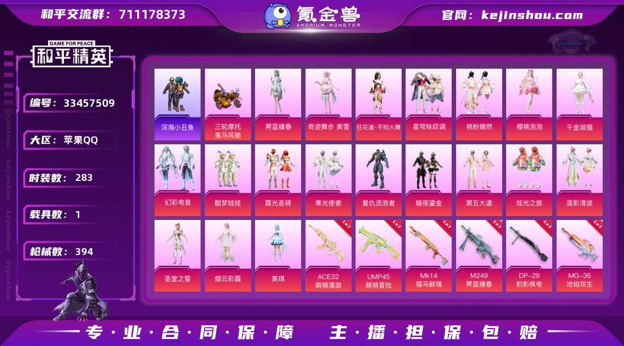 【19粉装14特效枪1载具 秒换绑不用等】 苹果Q区-132459热力值-283套装-394枪皮 【1载具】 鬼马风驰【2稀有】 奇异狩猎者 8号机粉螳螂【19粉装】 圣堂之誓 寒光使者 复仇流浪者 酣梦娃娃 霁蓝缠春 炫光之旅 莲影清波 霞光圣骑 第五大道 暗夜鎏金 角色-樱桃泡泡 桃粉嫣然 角色-狂花道·不知火舞 角色-美琪 角色-烟云彩露 星穹咏叹调 角色-奇迹舞步 美雪 幻彩电音 角色-千金淑猫【14特效枪】 Kar98K-圣域龙灵(3级) Mk14-福马献瑞(5级) M249-霁蓝缠春(5级) UMP45-萌骑冒险(3级) ACE32-萌骑漫游(4级) M417-第五大道(6级) Kar98K-未来歌姬(4级) MG3-洛神天依(7级) Mk14-樱桃泡泡(4级) DP-28-千金淑猫(7级) Kar98K-巳巳如意(5级) PKM-江南烟雨(7级) DP-28-豹影疾电(5级) MG-36-沧焰双生(5级)【383热门】 深海小丑鱼 暗夜契约(假黑丝) 小丑鱼 迅捷狂鲨 极速红龙 纯白誓言 豚鼠丹丹 冰公主 SS27特训 SS26特训 SS25特训 SS24特训 SS23特训 SS22特训 Mk47-洛神天依 M762-橘柚倾心 M24-未来战士 AKM-缤纷海域 AWM-飒粉甜心 SCAR-L-玉兔迎春 GROZA-2B战斗服款 GROZA-田园牧歌 M762-天降萌叽 M762-彩虹符号 Mk47-乌木金纹 SKS-糯团青竹 UZI-娇憨猪猪 UMP45-蓝色火焰 S12K-垂柳戏鸭 DBS-彩虹...