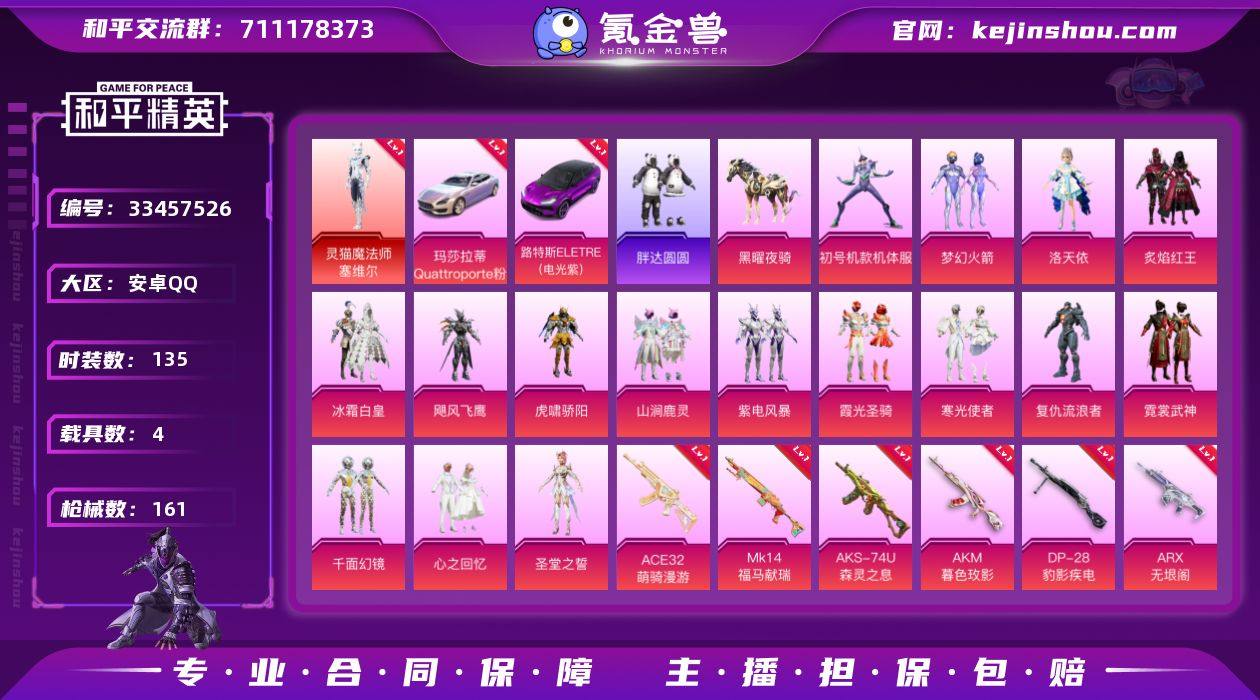【2级红装5级路特斯4级玛莎星紫螳螂17粉装14特效枪4载具素材号 秒换绑不用等】 安卓Q区-71131热力值-135套装-161枪皮 【1红装】 灵猫魔法师-塞维尔(2级)【4载具】 路特斯EL紫色(5级) 玛莎拉蒂Q幻星粉(4级) 兰博SVJ绿色 黑曜夜骑【1稀有】 奇异狩猎者【17粉装】 初号机款机体服(紫螳螂) 梦幻火箭 缤纷油彩(猪脸妹) 洛天依 圣堂之誓 冰霜白皇 寒光使者 复仇流浪者 霓裳武神 山涧鹿灵 炙焰红王 霞光圣骑 虎啸骄阳 飓风飞鹰 紫电风暴 心之回忆 千面幻镜(假木乃伊)【14特效枪】 Kar98K-圣域龙灵(2级) M416-灵猫魔法师(3级) Vector-最终圣卫者(3级) AKS-74U-森灵之息(4级) AKM-暮色玫影(3级) Mk14-福马献瑞(5级) ACE32-萌骑漫游(2级) SCAR-L-纯梦嫁纱(4级) MG3-洛神天依(1级) Vector-环太平洋(1级) ARX-无垠阁(4级) 烟雾弹-猫咪绅士(4级) 破片手榴弹-瓶中星球(5级) DP-28-豹影疾电(3级)【132热门】 胖达圆圆 雪山精英(老6服) 好奇恐龙 小丑鱼 军刀雅典娜 英勇保护者 极速红龙 GROZA-林间仙鹿 白色伏地魔 SS27特训 SS26特训 SS24特训 SS22特训 Mk47-洛神天依 Mini14-梦幻火箭 AKM-缤纷海域 AKM-环太平洋 SCAR-L-玉兔迎春 GROZA-田园牧歌 M762-天降萌叽 Mk47-乌木金纹 UZI-娇憨...