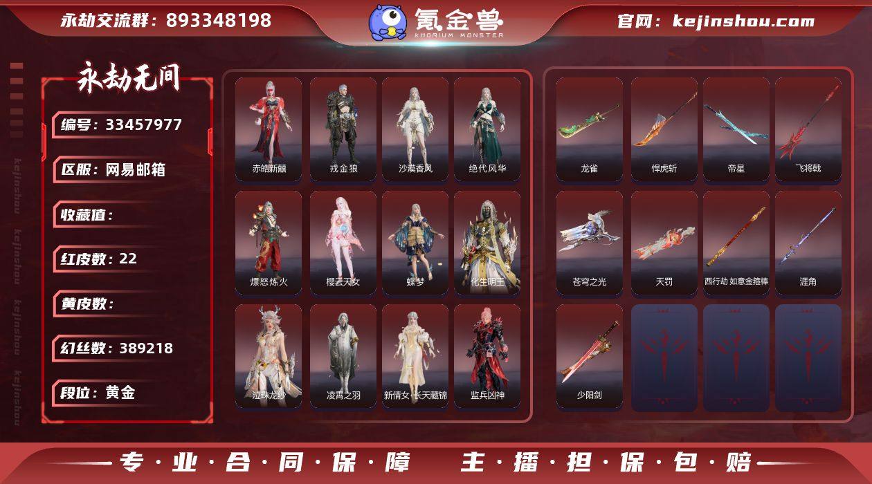 WJ6099,网易邮箱QQ,5月16可换绑,三人段位黄金2,声望9,22红,598金,等级538,收藏值400413,幻丝389218,金砖10,通行证Lv1,变身器,荆魂,千秋匠心凶虎,珥冰,炎烈珠,红色神品,凌霄之羽,绝代风华,沙漠香风,监兵凶神,画中仙,化生明王,新倩女幽魂长天藏锦,戎金狼,赤皓新囍,熛怒炼火,樱云天女,蝶梦,泣珠龙纱,天罚,苍穹之光,帝星,龙雀,悍虎斩,飞将戟,涯角,西行劫如意金箍棒,少阳剑,角色金色皮肤,P5R雨宫莲JOKER,封神录申公豹,司天命,幽篁山鬼,灵鹿巫者,朝闻道,禄运玉霄,封神录龙吉公主,藏雨阁主,金襦玉衫,夏日派对仲夏霜华,麟鹿大铠,花之倾奇,倾国倾城闭月,千秋匠心玉叶景,观山海青鸟,神鹰之女,浣烟纱,福瑞天泽,观山海秋神蓐收,西行劫悟空,行空裘,斑斓衣,干将莫邪,观山海冬神玄冥,秋藏桂,P5R奥村春NOIR,云溪仙子,绿野守护悠竹萌客,楚韵九歌山鬼,倾国倾城羞花,封神录妲己,护世四法广目天王,黄昏巫主,绮云衫,观山海腓腓,西行劫紫衣仙子,絮云衣,卷王,夜绸袍,封神录姜子牙,绿野守护山漠狞影,夏日派对椰风夕照,龙之影精武魂,龙之道至纯,决战平安京热海白珊,夏日派对弄潮逐浪,龙之影过江龙,