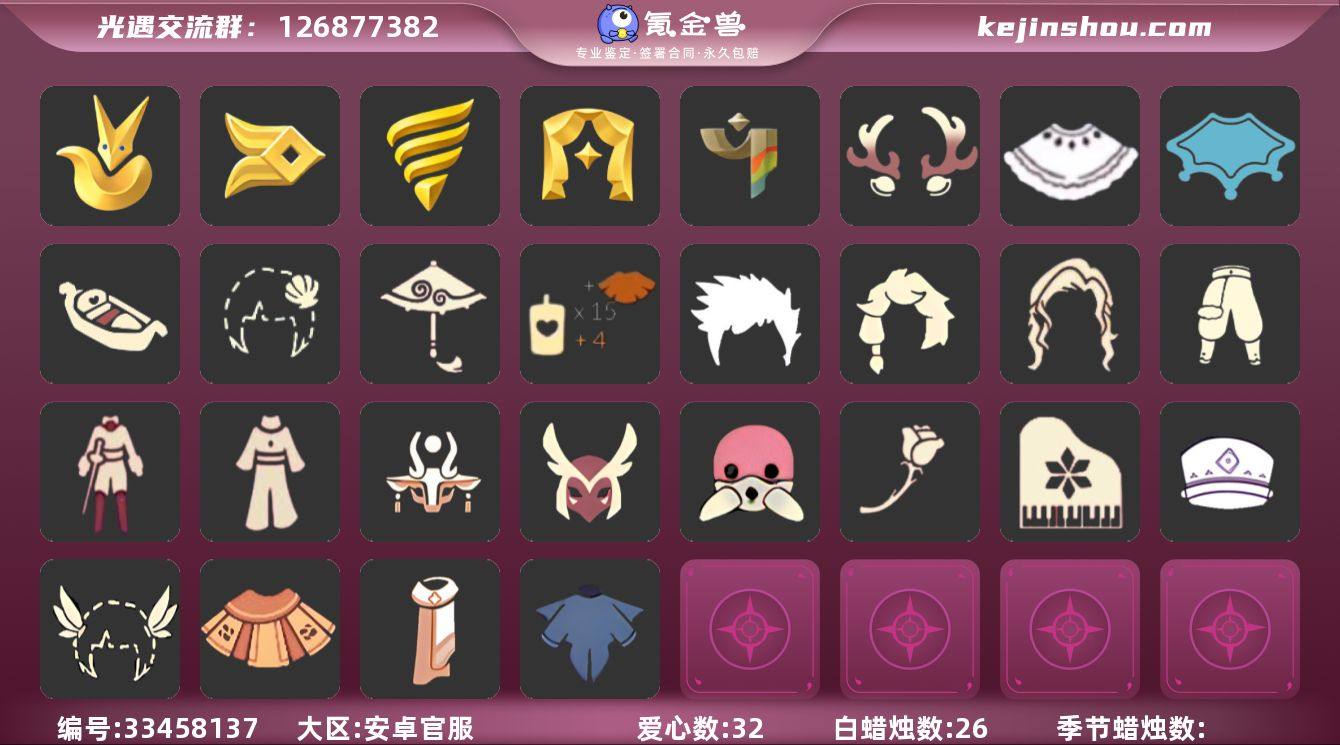 账号类型: 手机账号 季节已毕业: 小王子季,风行季,潜海季,表演季,彩染季 珍稀物品: 白枭,玫瑰花 礼包: 鹿角,白绒金,瑞雪,小船,贝壳,红伞,创始人 裤子: 搓澡巾,击剑裤,王子服 面具: 呼吸面具,黄眉企鹅面具,辉光羚羊面具 发型: 虚荣,单侧绑发,小王子发型 头饰: 羽毛发饰,平顶帽 斗篷: 燕尾斗篷,彩染围巾斗篷,玫瑰褶边斗篷 配饰: 高音钢琴,玫瑰花 亮点: 【优质装备】:表演季,白枭(帝企鹅发),小王子季(王子季),风行季,潜海季,羽毛发饰(多羽发饰),高音钢琴(白色高脚钢琴),玫瑰花,王子服(小王子套装),呼吸面具(潜水面具),黄眉企鹅面具,单侧绑发(单边小辫),小王子发型,燕尾斗篷,辉光羚羊面具,彩染季,小船(情人小船),鹿角(圣诞鹿角),瑞雪(瑞雪斗篷)(暖冬瑞雪),红伞(瑞气纸伞),白绒金(白雪斗篷),创始人(创始人斗篷),贝壳(贝壳发饰)
