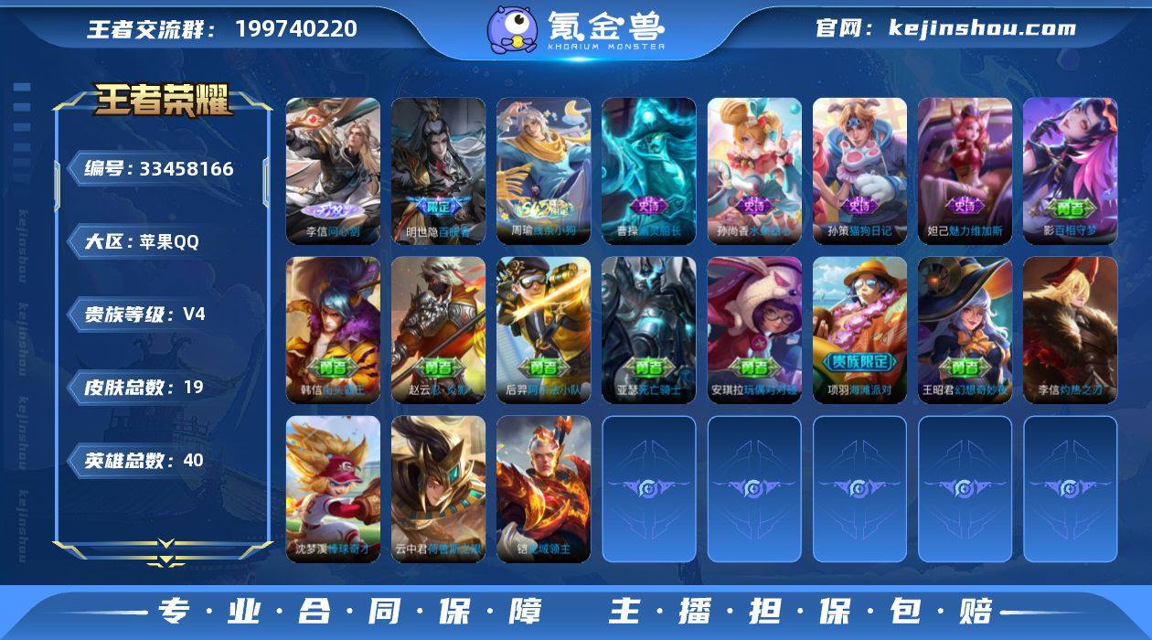 可换绑【精品无双小号推荐·万战金标李信·李信无双】 1按键 1王者印记 20五级铭文 无二次苹果Q-V4-19皮肤-1无双-5史诗【无双皮肤】:李信问心剑【限定皮肤】:项羽海滩派对【战令限定】:周瑜线条小狗【史诗皮肤】:明世隐百晓客,周瑜线条小狗,孙策猫狗日记,曹操幽灵船长,妲己魅力维加斯,孙尚香水果甜心【其他皮肤】:影百相守梦,王昭君幻想奇妙夜,后羿阿尔法小队,亚瑟死亡骑士,安琪拉玩偶对对碰,赵云忍炎影,韩信街头霸王,项羽海滩派对,云中君荷鲁斯之眼,李信灼热之刃,沈梦溪棒球奇才,铠龙域领主