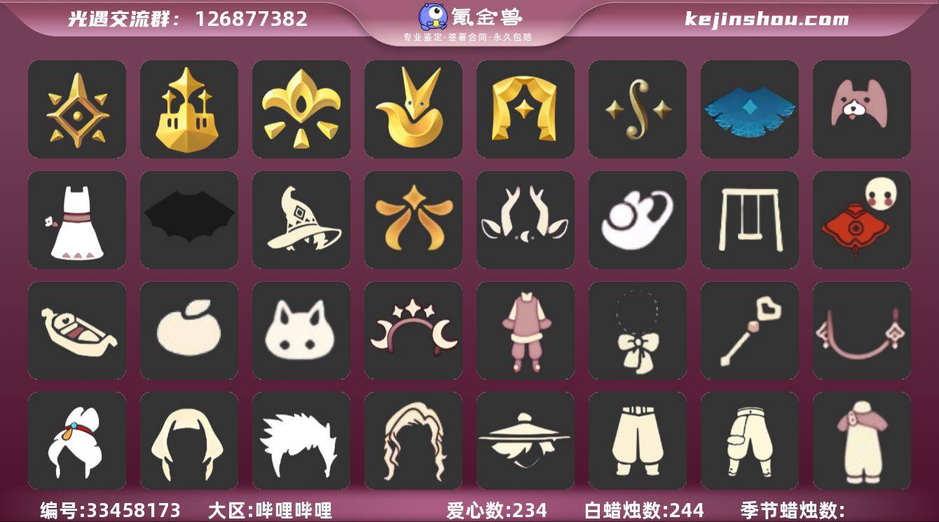 账号类型: 手机账号 季节已毕业: 预言季,梦想季,小王子季,表演季,集结季,二重奏季 完成地图: 晨岛,云野,雨林,霞谷,暮土,禁阁 珍稀物品: 阿努比斯(狗头),白枭,玫瑰花 礼包: 蝙蝠套,巫师,欧若拉之翼,九色鹿角,兔子鞋,秋千,福娃,小船,橘子,兔子,星月头饰,新年裤,蝴蝶结,魔法棒,新年耳钉,向日葵连衣裙,小狗周年发饰,线框斗篷礼包 裤子: 武士裤,背带裤,搓澡巾,击剑裤,王子服 面具: 阿努比斯,凤凰面具,黄眉企鹅面具 面饰: 红耳机 发型: 若笠,虚荣,小王子发型,留辫蘑菇头,飞天盘发 头饰: 行军锅头盔,蓝色音乐会,平顶帽 斗篷: 黄色蓑衣,海洋斗,蟑螂斗,遥鲲斗篷,黄色连帽披风,燕尾斗篷 配饰: 雨伞,高音钢琴,玫瑰花,圆鼓 亮点: 【优质装备】:预言季,阿努比斯(狗头),表演季,白枭(帝企鹅发),武士裤,梦想季,小王子季(王子季),行军锅头盔(六边锅帽子)(双耳锅帽子),高音钢琴(白色高脚钢琴),集结季,玫瑰花,王子服(小王子套装),蟑螂斗(凤凰斗篷),二重奏季,凤凰面具,黄眉企鹅面具,小王子发型,留辫蘑菇头,遥鲲斗篷(双翼遥鲲斗),黄色连帽披风(连帽斗篷)(斜边队长斗篷),燕尾斗篷,圆鼓(手拍大鼓),飞天盘发(九色鹿丸子头),蝙蝠套(蝙蝠斗篷)(南瓜头),欧若拉之翼,福娃(福娃礼包)(春之日礼包)(铜钱斗),...
