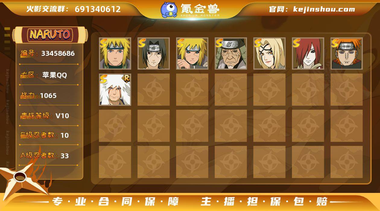 [18744797]V10 10S忍 33A忍 16通灵 1065.7W战力 可二次 可修改实名 【S级忍者】自来也 「舞之豪杰」,漩涡鸣人 「暴怒·第六尾」,漩涡鸣人·宇智波佐助,纲手「百豪」,波风水门「秽土转生」,猿飞日斩「秽土转生」,长门「秽土转生」,宇智波鼬 「须佐能乎」,佩恩「天道」,波风水门