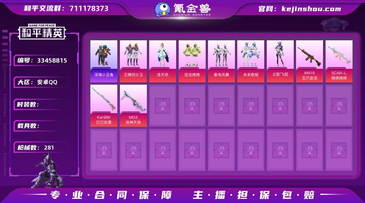【0载具 4特效枪 6粉装 281枪皮 210套装】M416-五爪金龙,SCAR-L-锦绣绵绵,Kar98K-巳巳如意,MG3-洛神天依,套装-雪山精英,套装-金耀舞者,套装-深海小丑鱼,套装-小丑鱼,套装-王牌四分卫,角色-洛天依,套装-恐龙拽拽,套装-紫电风暴,套装-未来歌姬,套装-老实芭蕉,套装-幻影飞狐,红米1,编号:DMASM05