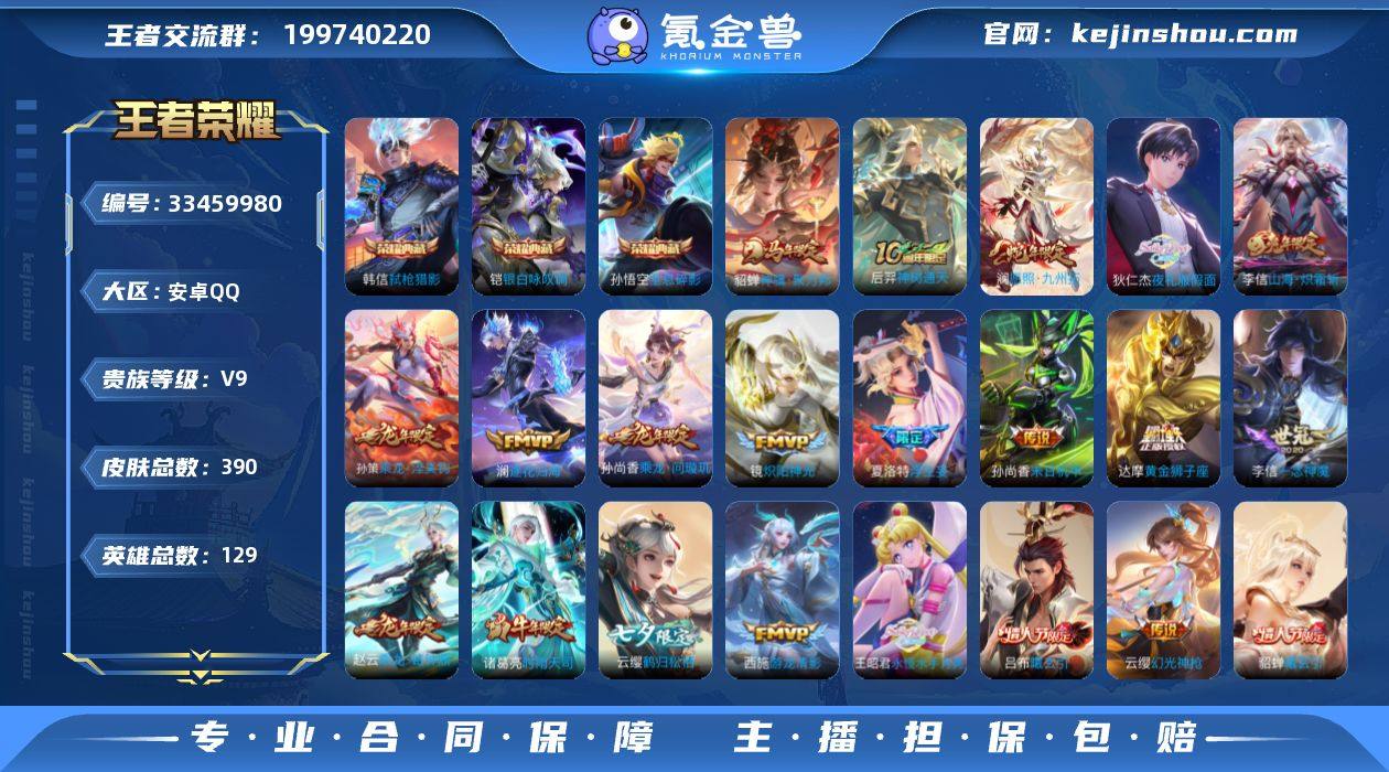 安卓Q-V9-永恒钻石III段位-129英雄-390皮肤-3典藏皮肤-36传说-116史诗 【英雄全皮】:刘邦全皮,狂铁全皮,猪八戒全皮,敖隐全皮,夏洛特全皮,赵怀真全皮,影全皮 【荣耀典藏】:孙悟空全息碎影,铠银白咏叹调,韩信弑枪猎影 【传说皮肤】:貂蝉神骥聚万邦,后羿神树通天,澜愿照九州拓,云缨幻光神枪,吕布曦玄引,貂蝉曦玄引,孙尚香乘龙问璇玑,孙策乘龙淬吴钩,赵云乘龙铭钟鼎,澜逐花归海,狄仁杰夜礼服假面,王昭君永恒水手月亮,云缨鹤归松栖,夏洛特浮生妄,干将莫邪画中仙,花木兰燃星之曲,虞姬无限倾心,项羽无限倾心,伽罗炽翼辉光,李信山海炽霜斩,吕布怒海麟威,王昭君星穹之声,孙策挚爱之约,西施游龙清影,诸葛亮时雨天司,镜炽阳神光,虞姬启明星使,李信一念神魔,刘备时之恋人,貂蝉猫影幻舞,干将莫邪久胜战神,达摩黄金狮子座,花木兰冠军飞将,貂蝉仲夏夜之梦,孙尚香末日机甲,狄仁杰超时空战士 【限定皮肤】:大乔绒语心约,姜子牙天穹之誓,杨戬破阵退雄兵,狄仁杰阴阳师,赵云皇家上将,墨子神迹守卫,嬴政优雅恋人,嬴政白昼王子,鲁班七号狮舞东方,庄周高山流水,高渐离死亡摇滚,阿轲迷踪丽影,钟无艳王者之锤,钟无艳超时空战士,白起夜都...