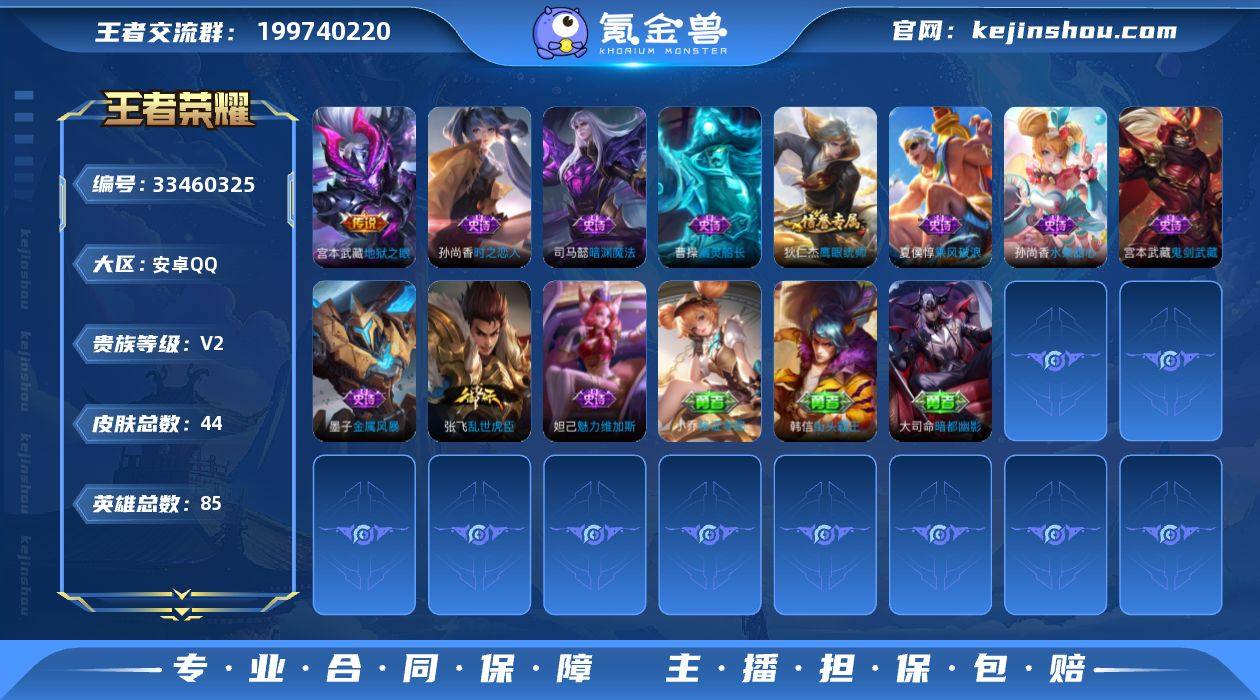 JJ4546:安卓Q-V2-永恒钻石III-85英雄-44皮肤-0典藏-0无双-0珍品传说-1传说-10史诗 【稀有英雄】 不知火舞 橘右京 娜可露露 韩信 赵云 【传说皮肤】 地狱之眼 【限定皮肤】 地狱之眼 【史诗皮肤】 暗渊魔法 鬼剑武藏 魅力维加斯 鹰眼统帅 金属风暴 乱世虎臣 时之恋人 水果甜心 幽灵船长 乘风破浪 【勇者皮肤】 白色死神 阴阳师 古海寻踪 阿尔法小队 死亡骑士 敏锐之力 海滩丽影 唤灵魔甲 探海日志 龙腾万里 万象初新 街头霸王 白执事 暗都幽影 【其他皮肤】 战争骑士 棒球奇才 海之征途 异域舞娘 东海龙王 埃及法老 战争女神 特种部队 赤焰之缨