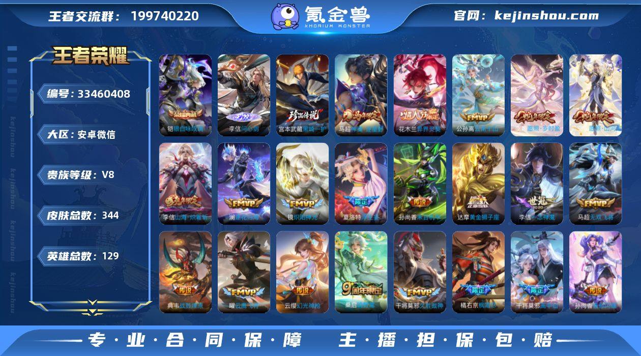 安卓WX-V8-最强王者段位-129英雄-344皮肤-1典藏皮肤-1无双-1珍品传说-23传说-108史诗 【英雄全皮】:孙权全皮,橘右京全皮,苍全皮,李信全皮,敖隐全皮,蒙恬全皮,司空震全皮,戈娅全皮,空空儿全皮 【荣耀典藏】:铠银白咏叹调 【无双皮肤】:李信问心剑 【珍品传说】:宫本武藏黑崎一护 【传说皮肤】:马超神骥逐星野,花木兰异界灵契,公孙离云诺千山,司空震愿照山河定,虞姬愿照岁时盈,云缨幻光神枪,桑启鸣野蒿,典韦战鼓燎原,澜逐花归海,夏洛特浮生妄,干将莫邪画中仙,李信山海炽霜斩,橘右京枫霜尽,孙尚香音你闪耀,马超无双飞将,铠绛天战甲,镜炽阳神光,虞姬启明星使,曜云鹰飞将,李信一念神魔,干将莫邪久胜战神,达摩黄金狮子座,孙尚香末日机甲 【限定皮肤】:李白谪仙醉月,狄仁杰阴阳师,赵云皇家上将,赵云引擎之心,庄周高山流水,高渐离死亡摇滚,高渐离玩趣恶龙,钟无艳超时空战士,扁鹊奇幻香踪,白起夜都怪侠,芈月幻夜卜梦,元歌无心,甄姬落雪兰心,马可波罗暗影游猎,狄仁杰魔术师,狄仁杰万华元夜,达摩沙漠行僧,项羽海滩派对,程咬金演武夺筹,王昭君午后时光,兰陵王金庭之子,橘右京枫霜尽,后羿圣弓游侠,李元芳云中旅人,虞姬启明星...