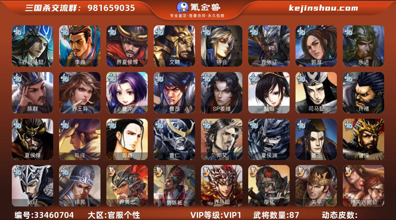 VIP等级: VIP1 官阶: 千夫长 武将数量: 87 魏国武将: 张辽,SP姜维,曹昂,曹操,曹冲,曹丕,曹仁,郭嘉,荀彧,界王异,陈群,乐进,郭淮,夏侯惇,许褚,界张辽,钟会,文聘,界夏侯惇,司马懿,甄姬,徐晃,夏侯渊,李典,邓艾,界司马懿 蜀国武将: 界黄忠,赵云,界刘备,糜竺,黄月英,关羽,吴懿,张飞,魏延,界周仓,刘禅,界赵云,周仓,界关兴张苞,诸葛亮,关平,庞统,马超,廖化,孟获,黄忠,刘备,界马超,势陈祗 吴国武将: 周泰,吕蒙,孙亮,孙尚香,程普,大乔,韩当,陆逊,诸葛瑾,界黄盖,界周瑜,孙权,界甘宁,甘宁,界大乔,孙坚,孙鲁育,周瑜,小乔,潘璋马忠,黄盖,界陆逊,孙邵,朱桓 群国武将: 华雄,袁术,于吉,吕布,李儒,潘凤,界华佗,贾诩,张角,袁绍,华佗,貂蝉,颜良文丑