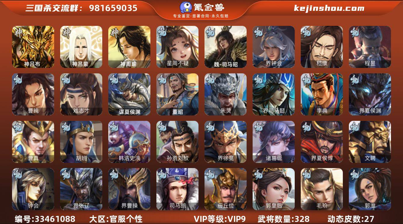 VIP等级: VIP9 官阶: 骠骑将军 武将数量: 328 动态皮肤数量: 27 神将: 神吕布,神吕蒙,神周瑜 魏国武将: 戏志才,曹纯,程昱,嵇康,界钟会,魏-司马昭,唐咨-魏,张辽,SP蔡文姬,SP关羽,SP贾诩,SP姜维,SP庞德,卞夫人,蔡贞姬,曹昂,曹操,曹冲,曹洪,曹丕,曹仁,曹叡,王异,张恭,鲁芝,界满宠,界曹植,满宠,荀攸,钟繇,郭嘉,牵招,荀彧,杜畿,界郭嘉,崔琰,界曹丕,界荀彧,朱灵,界甄姬,吕虔,界陈群,界王异,界许褚,界郭淮,华歆,陈群,界邓艾,界曹休,袁涣,李通,乐进,辛宪英,郭淮,毛玠,郭皇后,毌丘俭,夏侯惇,曹植,司马朗,界曹操,星周不疑,许褚,界张辽,张郃,钟会,文聘,曹彰,界夏侯惇,诸葛诞,司马懿,甄姬,界徐晃,徐晃,孙资刘放,韩浩史涣,胡班,曹真,典韦,界夏侯渊,夏侯渊,李典,于禁,邓艾,界司马懿,朱灵(国战),董昭,谋夏侯渊 蜀国武将: 花鬘,傅佥,谯周,赵襄,谋赵云,马云騄,谋黄月英,徐庶,杨仪,界关羽,界诸葛亮,邓芝,界伊籍,严颜,界黄月英,界张嶷,赵云,张松,李丰,界刘备,谋法正,界刘禅,刘封,糜竺,谋庞统,黄月英,刘巴,关羽,王甫赵累,吴懿,祝融,张飞,黄皓,魏延,界周仓,界法正,糜夫人,界孟获,刘禅,界赵云,界姜维,张翼,关银屏,界祝融,SP孙尚香,SP徐庶,卧龙诸葛,周仓,简雍,界关兴张苞,诸葛亮,界张飞,法正,界简雍,...