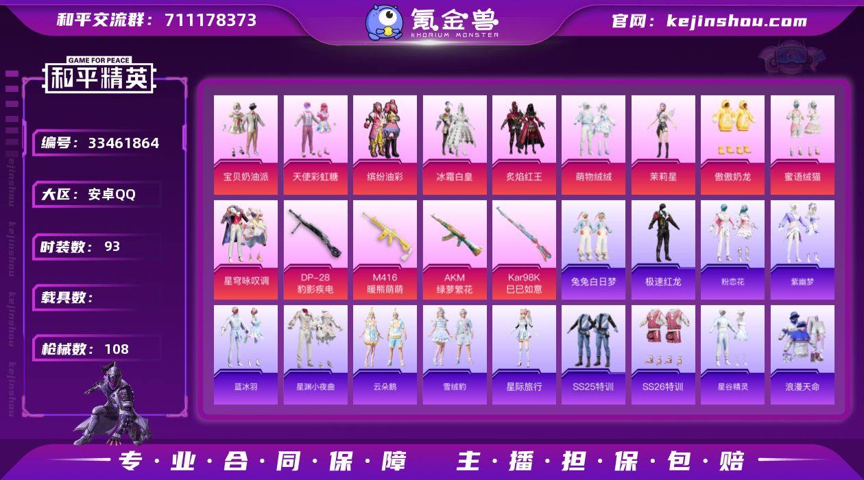 【957810】M1047640【公主号10粉装-6特效枪 缤纷油彩 天使彩虹糖 宝贝奶油派 浪漫天命】安卓手Q-10粉装-6特效枪-93套装-108枪皮-8王牌印记-不朽星钻Ⅴ-36515热力值【10粉装】蜜语绒猫,萌物绒绒,傲傲奶龙,天使彩虹糖,角色-茉莉星,冰霜白皇,缤纷油彩,炙焰红王,星穹咏叹调,宝贝奶油派【6特效枪】Kar98K-巳巳如意[5级],UMP45-萌骑冒险[5级],Mk14-福马献瑞[1级],DP-28-豹影疾电[5级],M416-暖熊萌萌[7级],AKM-绿萝繁花[5级]【1稀有】浪漫天命【8飞行器】空岛之星尾迹,萌物绒绒飞行器,幻星舰长飞行器,破刃行动尾迹,狂鲨锋刃飞行器,异域银装飞行器,炫彩糖果飞行器,马上有福飞行器【3头盔】甜蜜誓约头盔,甜心宝贝头盔,童趣迷兔头盔【184其它衣服和枪皮】香榭午后,龙的传人,惊鸿侠骨,贝斯之夜,异域银装,白熊同盟,白糯汤圆,SS26特训,角色-2B战斗服款,小熊蜂蜜罐,破蛋小黄鸡,竞技名士,粉恋花,长空猛禽,鹤鸣,顶瓜瓜,极速光影,暖暖麦兜,月蓝流光,晨曦薄雾,角色-鲛海歌灵,马上来财,旭日情侣,蓝冰羽,角色-星际旅行,福星高照,老实芭蕉,雪绒豹,SS32特训,空岛之星,元气之梦,都市魅力,极速红龙,锦衣飞扬,SS27特训,星谷精灵,无暇誓言,疯狂小兔子,云朵鹅,雨过天青,白色伏地魔,小鸟芋圆,猛禽,战术大师,...