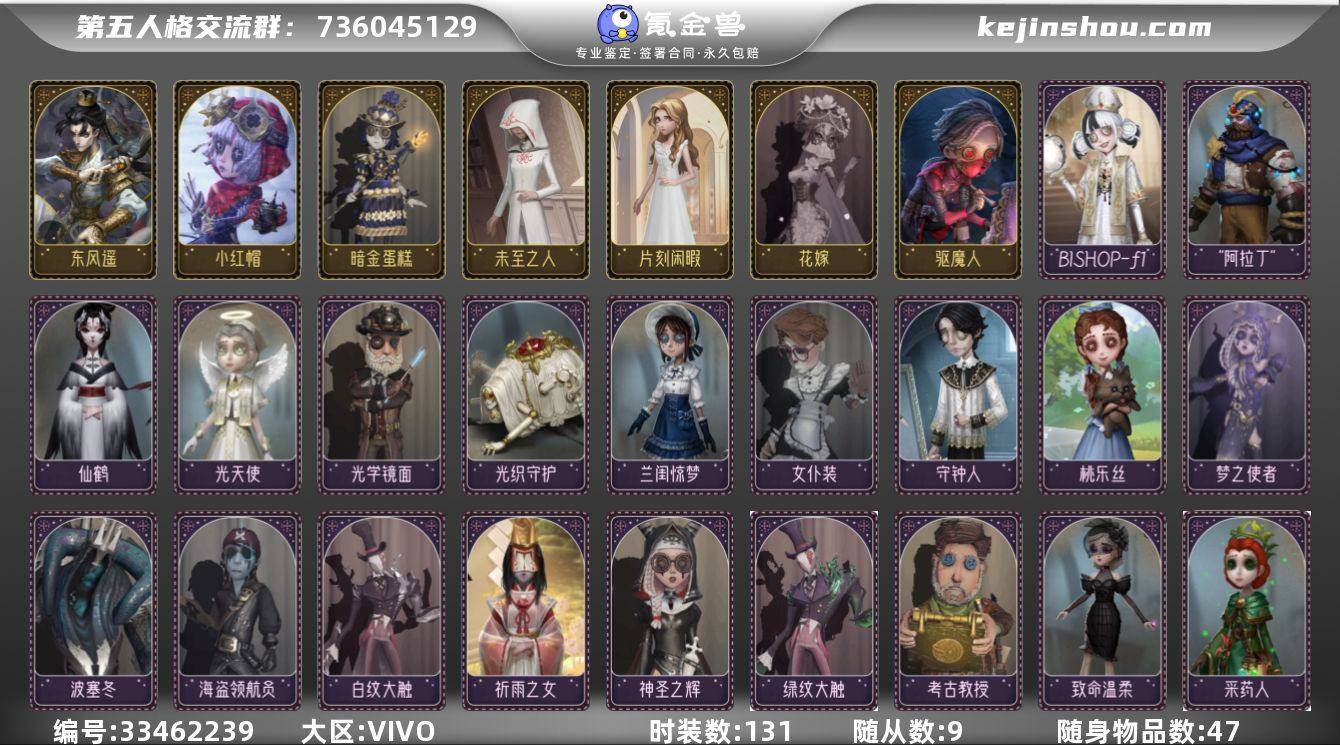 账号类型: 手机账号 时装数: 131 时装: 厂长-“阿拉丁”,红蝶-花嫁,红蝶-仙鹤,红蝶-祈雨之女,黄衣之主-波塞冬,“杰克”-绿纹大触,“杰克”-白纹大触,机械师-小红帽,祭司-神圣之辉,祭司-梦之使者,律师-海盗领航员,魔术师-光学镜面,冒险家-考古教授,盲女-暗金蛋糕,盲女-音波,入殓师-驱魔人,入殓师-守钟人,宿伞之魂-东风遥,调香师-致命温柔,调酒师-黑玫瑰,幸运儿-女仆装,“小女孩”-桃乐丝,医生-光天使,医生-采药人,园丁-兰闺惊梦,蜘蛛-光织守护,拉拉队员-BISHOP-f1,爱丽丝·德罗斯-未至之人,爱丽丝·德罗斯-片刻闲暇