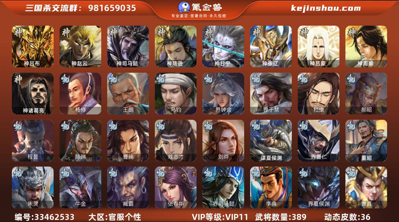 VIP等级: VIP11 官阶: 大将军 武将数量: 389 动态皮肤数量: 36 神将: 神甘宁,神陆逊,神吕布,神司马懿,神张辽,神赵云,神吕蒙,神周瑜,神诸葛亮 魏国武将: 刘晔,戏志才,曹纯,陈琳,程昱,郝昭,嵇康,界于禁,界钟会,马钧,王朗,杨修,唐咨-魏,张辽,SP蔡文姬,SP曹仁,SP关羽,SP贾诩,SP姜维,SP庞德,卞夫人,蔡贞姬,曹昂,曹操,曹冲,曹洪,曹丕,曹仁,曹叡,王异,张恭,鲁芝,界满宠,曹休,界曹植,满宠,荀攸,王基,钟繇,蒯越蒯良,郭嘉,荀彧,杜畿,界郭嘉,崔琰,界曹丕,界荀彧,朱灵,界甄姬,辛毗,吕虔,界王异,界许褚,界郭淮,华歆,陈群,界邓艾,界典韦,李通,乐进,辛宪英,郭淮,界曹彰,郭皇后,毌丘俭,夏侯惇,曹植,司马朗,界曹操,许褚,界张辽,谋徐晃,张郃,钟会,文聘,曹彰,界夏侯惇,诸葛诞,司马懿,甄姬,界徐晃,徐晃,界曹仁,孙资刘放,韩浩史涣,曹真,典韦,界夏侯渊,夏侯渊,李典,于禁,邓艾,界司马懿,张春华,臧霸,牛金,朱灵(国战),董昭,谋夏侯渊 蜀国武将: 董允,关索,沙摩柯,王平,张星彩,赵襄,诸葛瞻,谋赵云,马云騄,徐庶,界魏延,杨仪,吕凯,界关羽,界诸葛亮,邓芝,界伊籍,胡金定,费祎,严颜,界黄月英,赵云,张松,彭羕,李丰,界刘备,界刘禅,刘封,糜竺,谋庞统,黄月英,关羽,王甫赵累,吴懿,吴班,界廖化,向宠,祝融,张飞,黄皓,...