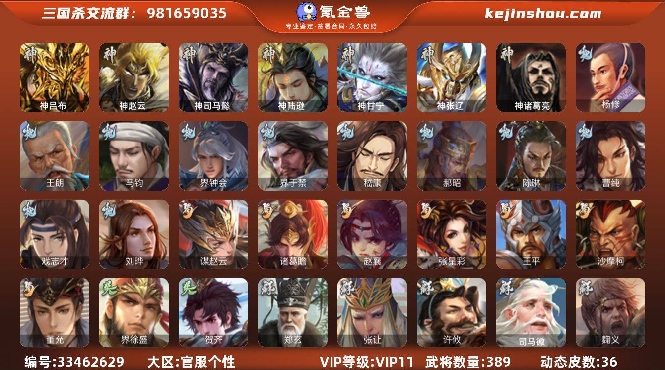 标题:S37239 【支持分期】 VIP等级:VIP11 官阶:大将军 史诗武将数量:42 动态皮肤数量:36 史诗宝珠数量:0 将魂数量:4058 雁翎数量:5739 心愿积分:5765 史诗武将(魏国):马钧,界钟会,戏志才,王朗,嵇康,杨修,陈琳,刘晔,界于禁,程昱,曹纯,郝昭 史诗武将(蜀国):谋赵云,沙摩柯,关索,张星彩,王平,诸葛瞻,马云禄,董允,赵襄 史诗武将(吴国):界徐盛,贺齐 史诗武将(群雄):刘焉,界左慈,许攸,麹义,庞德公,郑玄,张让,司马徽,王允,左慈,兀突骨,沮授,陶谦 史诗武将(神将):神甘宁,神赵云,神陆逊,神司马懿,神吕布,神张辽