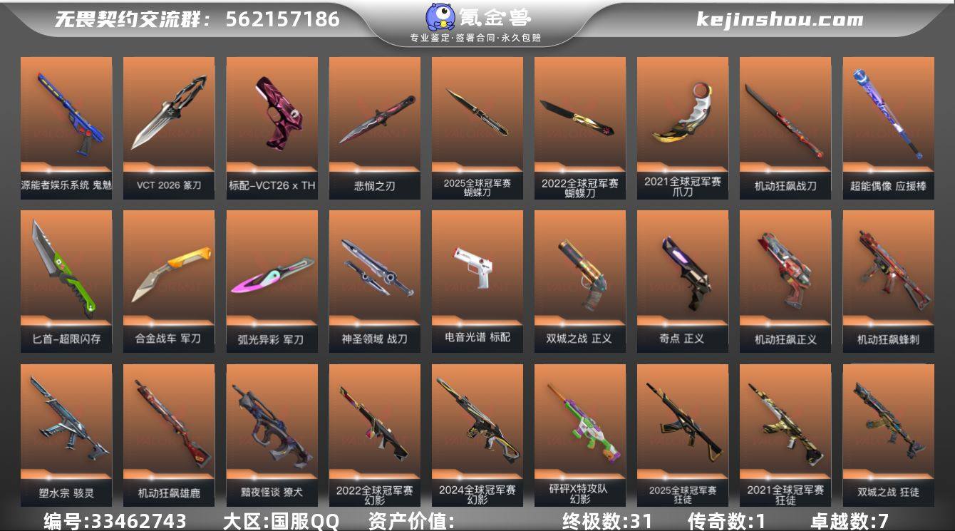 【套装】:2025全球冠军赛套装,2022全球冠军赛套装,2021全球冠军赛套装,VCT 2026 赛季套装,无畏契约季前邀请赛套装,离火刃套装,《英雄联盟:双城之战》套装,机动狂飙套装,无畏启程套装,离火刃套装 【英雄】:幻棱,炼狱,维斯,暮蝶,钛狐,壹决,铁臂,捷风,雷兹,幽影,不死鸟,贤者,猎枭,蝰蛇,零,芮娜,奇乐,尚勃勒,霓虹,斯凯,夜露,星礈,K/O,海神,盖可,黑梦,钢锁 【近战武器】:近战武器-2025全球冠军赛 蝴蝶刀,近战武器-2022全球冠军赛 蝴蝶刀,近战武器-2021全球冠军赛 爪刀,近战武器-VCT 2026 篆刀,近战武器-无畏契约季前邀请赛 悲悯之刃,近战武器-离火刃,近战武器-超能偶像 应援棒,近战武器-超限闪存 匕首,近战武器-合金战车 军刀,近战武器-弧光异彩 军刀,近战武器-机动狂飙 战刀,近战武器-神圣领域 战刀 【狂徒】:狂徒-2025全球冠军赛,狂徒-2021全球冠军赛,狂徒-混沌序曲,狂徒-机动狂飙,狂徒-双城之战,狂徒-盖亚的复仇,狂徒-紫阙金琅,狂徒-超能偶像,狂徒-弧光异彩 【幻影】:幻影-2022全球冠军赛,幻影-2024全球冠军赛,幻影-砰砰X特攻队,幻影-侦察力量,幻影-超限闪存,幻影-合金战车,幻影-噬源兽防卫工程,幻影-神圣...