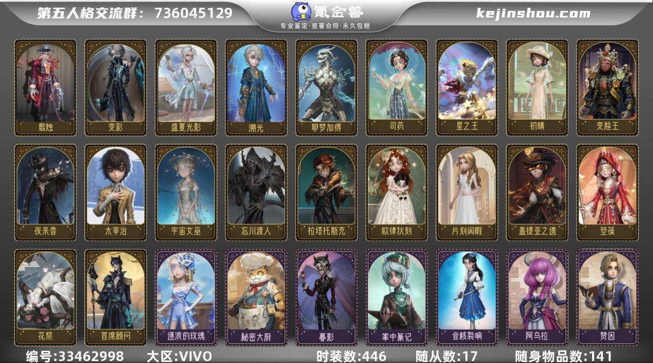 账号类型: 手机账号 时装数: 446 时装: 红蝶-彼岸,红夫人-最后一舞,画家-长生,“杰克”-白纹大触,“杰克”-忘川渡人,“杰克”-夜来香,祭司-冰中蝶,勘探员-矿业董事,鹿头-蒸汽朋克,冒险家-考古教授,牛仔-逆刃之鞭,“囚徒”-太宰治,宿伞之魂-十字路口的美少年,宿伞之魂-安魂曲,宿伞之魂-残花泪,“使徒”-校监夫人,“使徒”-荒野女巫,调酒师-女高音,小丑-焗炉,小丑-变脸王,幸运儿-苗木诚,幸运儿-拉塔托斯克,园丁-宇宙女巫,佣兵-思明,邮差-琴键,蜘蛛-花祭,杂技演员-梶井基次郎,摄影师-安宁,“记录员”-执政官,“小女孩”-欧律狄刻,病患-天使向导,破轮-胡桃夹子,昆虫学者-箜篌,隐士-首席顾问,守夜人- 隐形人,画家-温暖的平安夜,黄衣之主-克朗普斯,勘探员-盖提亚之遗,园丁- 初晴,爱丽丝·德罗斯-片刻闲暇,小提琴家-不羁的浪漫,“慈善家”-斗牛士之吻,渔女-破魔之刃,调酒师-逐浪的玫瑰,佣兵-弦音畸变,火灾调查员-“膨化”,时空之影-“有机磷”,宿伞之魂-桃面书生,“喧嚣”-星之王,画家-多色印刷,飞行家-警戒哨台,医生-司药,孽蜥-耶梦加得,骑士-艺术品商人,病患-溯光,黄衣之主-衣帽架先生,“慈善家”-鎏金的表演大师,摄影师-盛夏光影,古董商-陶梦嫣,医生-银锑 ,入殓师-变彩,园丁-源自星辰,祭司-阿乌拉,冒险家-赞因...