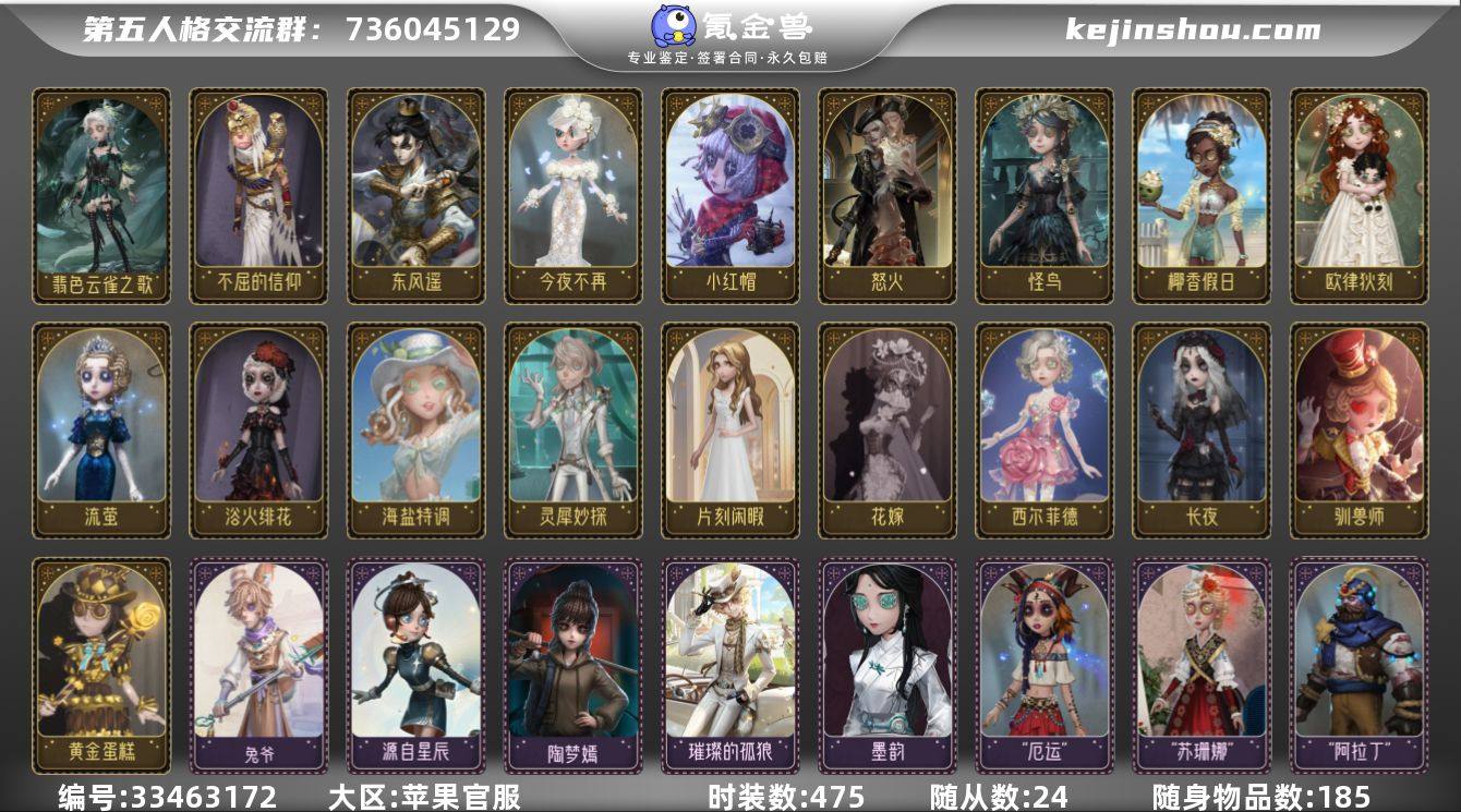 账号类型: 手机账号 时装数: 475 时装: 26号守卫-蛋壳先生,厂长-海怪船长,厂长-亚瑟王,厂长-“阿拉丁”,大副-罗勒,红蝶-花嫁,红蝶-紫孔雀,红蝶-白孔雀,红夫人-最后一舞,画家-江户川乱步,画家-达芬奇,“杰克”-绿纹大触,“杰克”-白纹大触,机械师-小红帽,机械师-糖果少女,机械师-咫尺天涯,机械师-归来者,祭司-神圣之辉,祭司-梦之使者,祭司-“厄运”,祭司-撒玛拉,击球手-反骨之缚,空军-海盗枪手,空军-“苏珊娜”,勘探员-公路骑士,勘探员-迷途诗人,哭泣小丑-蚕食者,律师-兰斯洛特,律师-毛利小五郎,鹿头-蒸汽朋克,鹿头-阿努比斯,蜡像师-怒火,魔术师-光学镜面,魔术师-文学教授,盲女-甜心蛋糕,盲女-黄金蛋糕,盲女-吉尔达,牛仔-蜡烛人,孽蜥-狰,“囚徒”-灵犀妙探,“囚徒”-冬蝉,入殓师-诺曼,宿伞之魂-东风遥,宿伞之魂-残花泪,摄影师-阿波罗,“使徒”-荒野女巫,调香师-笼中之蝶,调香师-时之砂,调香师-今夜不再,调香师-冰上舞蹈,调酒师-海盐特调,舞女-驯兽师,舞女-恶之花,玩具商-浴石商人,小丑-焗炉,小丑-树形背景板,幸运儿-双一,先知-不屈的信仰,“小女孩”-桃乐丝,小说家-大师牌,医生-光天使,医生-往昔,医生-采药人,医生-浴火绯花,园丁-兰闺惊梦,园丁-罗刹绯春,园丁-怪鸟,佣兵-寄生,佣兵-感染,佣兵-白鹰...