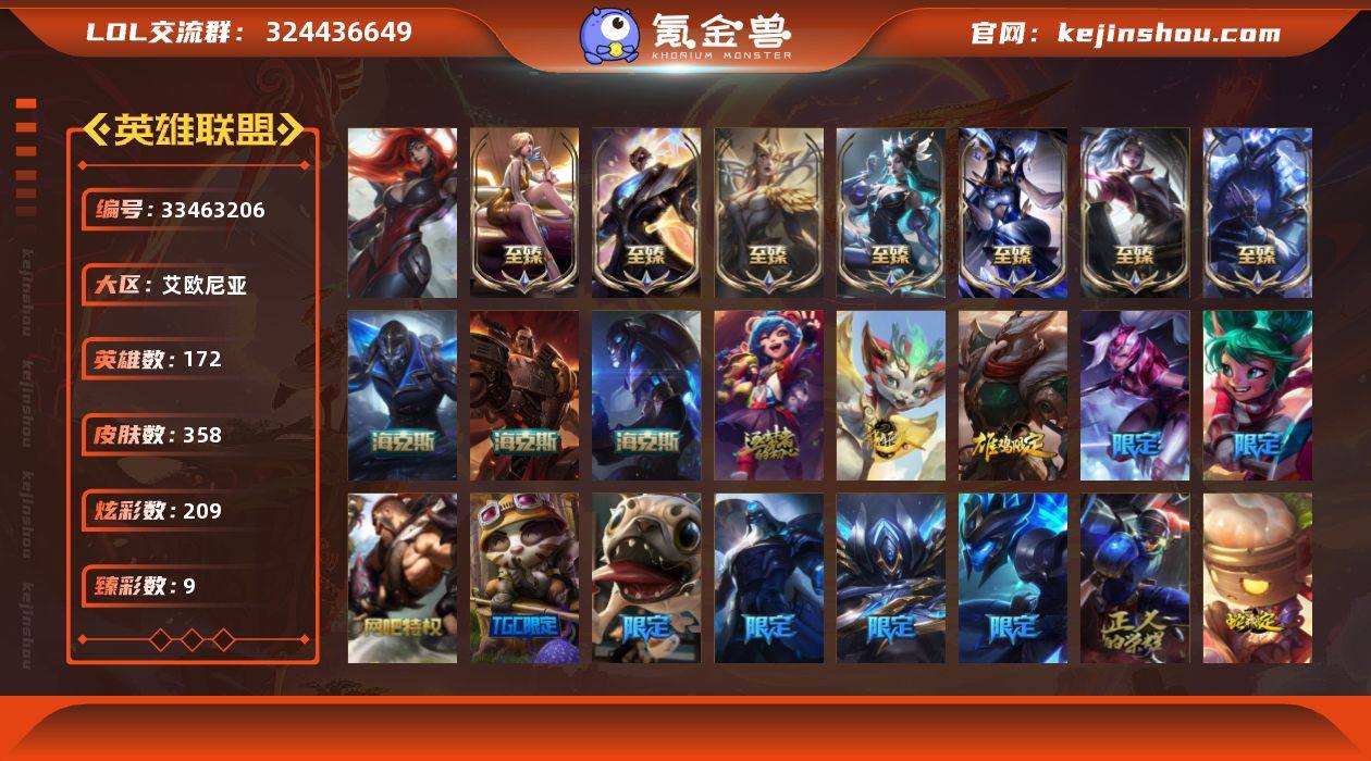 未定级段位-172英雄-358皮肤-209炫彩-1终极-12神话-51限定-38传说-88史诗 【神话皮肤】:十周年纪念安妮,神凰行者瑞羽圣凰艾尼维亚 【至臻皮肤】:至臻魔女乐芙兰,至臻KDA伊芙琳,至臻魔女阿卡丽,至臻青花瓷丽桑卓,至臻星之守护者辛德拉,至臻DRX亚托克斯,至臻未来战士锤石 【海克斯皮肤】:海克斯科技卡萨丁,海克斯科技玛尔扎哈,恐惧新星德莱厄斯 【臻彩皮肤】:天龙之子卡莎飞龙乘云,吕布奉先炫金战神,冠军掠夺者卡兹克凯旋圣装,冠军之隐劫凯旋圣装,星之守护者金克丝黑洞,可爱可爱粉红红布里茨,海之歌艾希冰爽浪花,魔女阿卡丽虚荣,净雪之月莫甘娜冬虹 【年限皮肤】:司马懿仲达,天龙之子斯莫德,点心宝贝阿木木 【情人节限定】:甜心之羽霞 【冰雪限定】:幸福女神乐芙兰,持胡萝卜的雪人易,圣诞精灵崔丝塔娜,夺命美人卡特琳娜,雪默丁格,冰雪驯鹿波比,圣诞老人古拉加斯,雪球也能爆炸吉格斯,冰雪节辛吉德,冰雪女神辛德拉 【终极皮肤】:武装战姬厄运小姐 【限定皮肤】:冠军之矛卡莉丝塔,冠军掠夺者卡兹克,冠军之志瑞兹,2022全球总决赛阿兹尔,Fnatic库奇,暗杀星蒙多,暗杀星努努和威朗普,SKTT1贾克斯,SKTT1婕拉,SKTT1李青,SSW辛吉德,SSW泰...