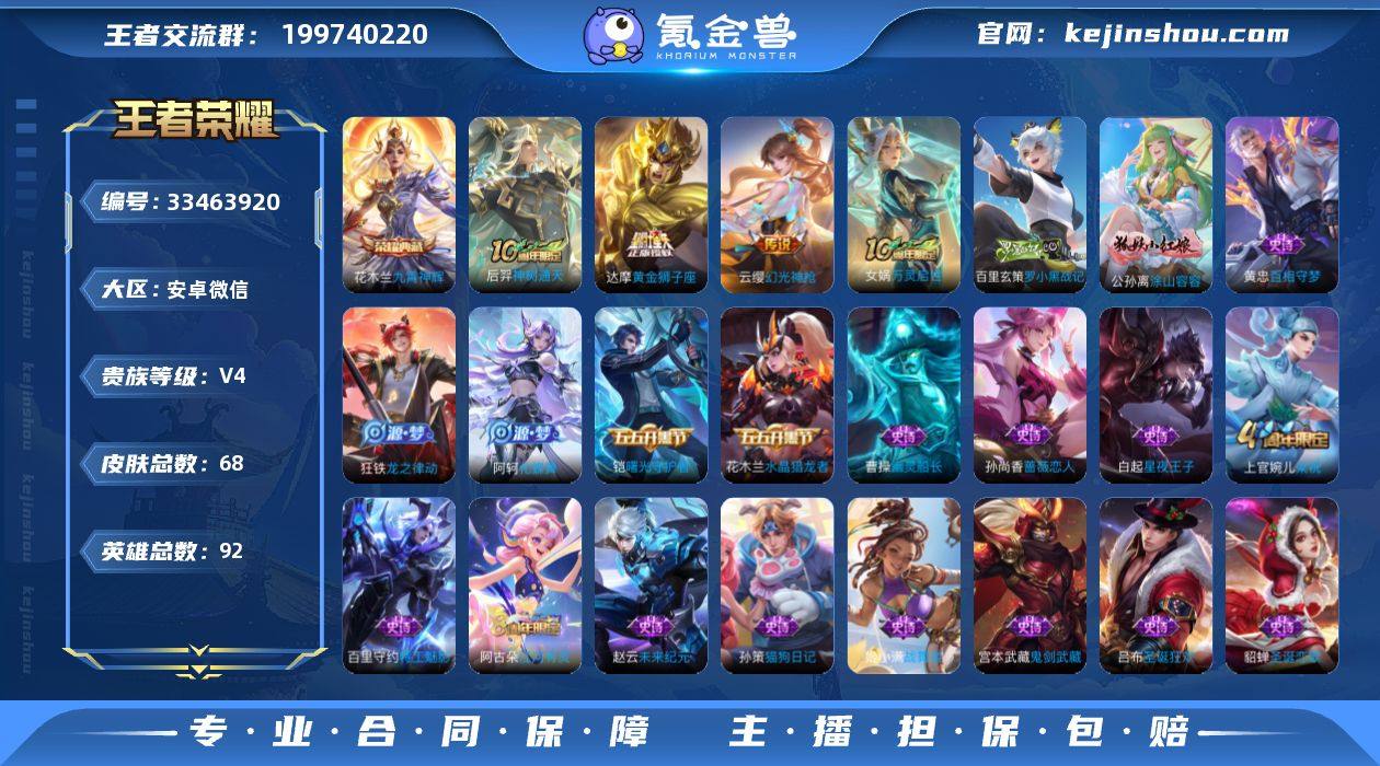 AL699968 【亏本清仓】 皮肤数68 传说皮肤数3 史诗皮肤数23 英雄数92 营地id1742976793 贵族等级【文本】贵族4级 【贵族4级】 【是】 【启用】 【是】 【支持】 荣耀典藏1 内测皮肤1 限定皮肤18 赛季限定7 史诗皮肤23 战令限定2 勇者皮肤32 其他皮肤9 荣耀典藏:花木兰九霄神辉; 内测皮肤:孙尚香蔷薇恋人; 限定皮肤:百里玄策罗小黑战记,女娲万灵启世,公孙离涂山容容,鬼谷子克喵,狂铁龙之律动,孙尚香蔷薇恋人,项羽海滩派对,阿轲化蝶舞,马超访茗客,孙膑茶境仙,太乙真人谧流熔炉,东皇太一噬灭天穹,上官婉儿梁祝,刘邦剑破天穹,鬼谷子天穹祈灯,阿古朵江河有灵,狄仁杰阴阳师,张良古海寻踪; 赛季限定:亚瑟荣光之誓,甄姬逆浪荇歌,太乙真人谧流熔炉,东皇太一噬灭天穹,刘邦剑破天穹,鬼谷子天穹祈灯,张良古海寻踪; 史诗皮肤:赵云未来纪元,百里玄策罗小黑战记,白起星夜王子,曹操幽灵船长,女娲万灵启世,宫本武藏鬼剑武藏,公孙离涂山容容,狂铁龙之律动,黄忠百相守梦,孙尚香蔷薇恋人,孙策猫狗日记,铠曙光守护者,百里守约特工魅影,阿轲化蝶舞,孙膑茶境仙,上官婉儿梁祝,吕布圣诞狂欢,姬小满战舞者,花木兰水晶猎龙者,张飞乱世虎臣,阿古朵江...