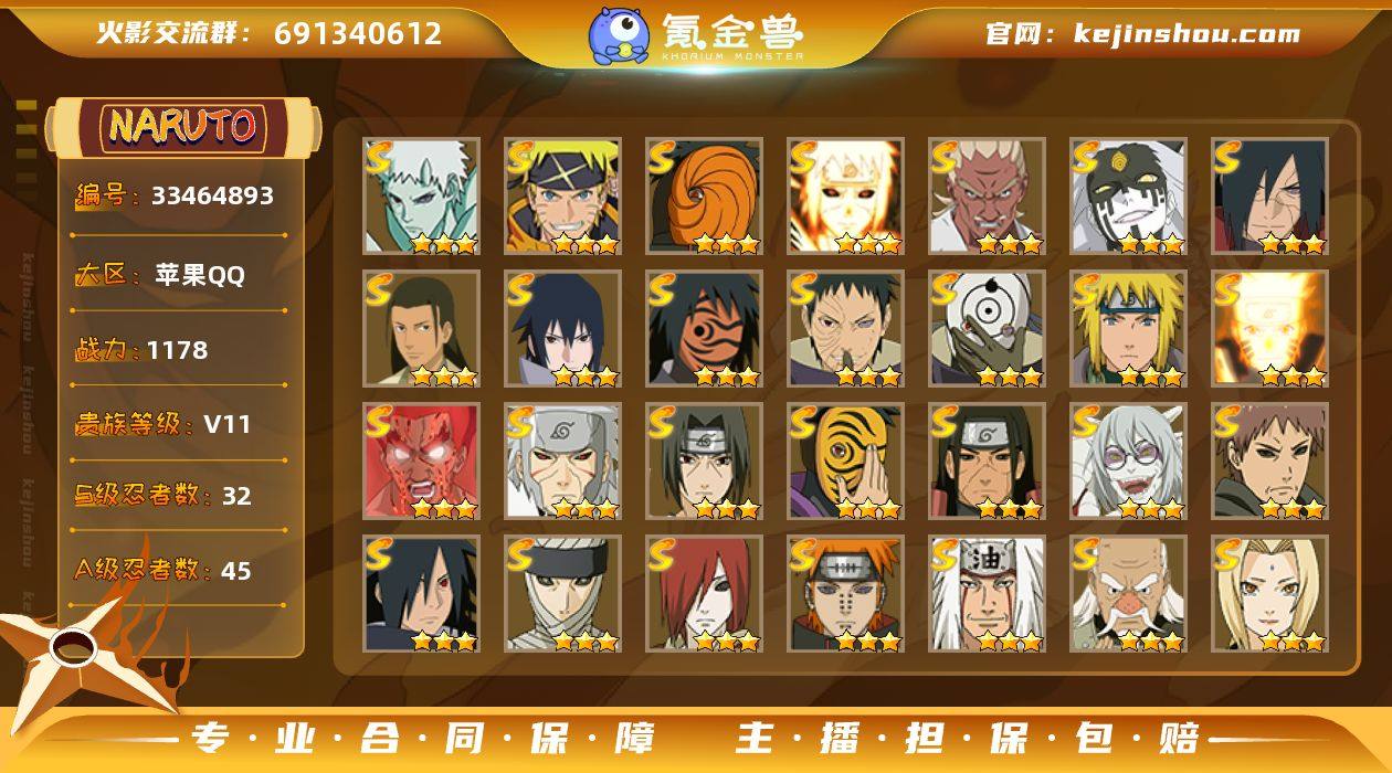 【HYYH1532】VIP等级V11/战力1178W/S忍数量32/A忍数量45/二星A-波风水门「新春限定」/二星A-大野木「侠隐江湖」/三星S-纲手/三星S-波风水门「九喇嘛连结」/三星S-宇智波带土「十尾人柱力」/二星A-达鲁伊「五代目雷影」/二星A-飞段「死司凭血」/三星S-无「二代目土影」/二星A-宇智波止水/五星A-猿飞阿斯玛/二星A-照美冥「五代目水影」/五星A-迈特凯/三星S-自来也/二星A-奇拉比「忍界大战」/三星S-千手扉间「秽土转生」/三星S-千手柱间·木叶创立/二星A-神秘面具男 「忍者之路」/三星S-罗砂「四代目风影」/三星S-药师兜「仙人模式」/三星S-大筒木桃式/二星A-长十郎「六代目水影」/二星A-蝎「绯流琥」/三星S-宇智波斑「白面具」/三星S-迈特凯「死门」/二星A-宇智波带土「暴怒」/二星A-黑土「四代目土影」/二星A-迪达拉「秽土转生」/二星A-药师兜「半蛇斗篷」/三星S-春野樱 「忍界大战」/二星A-宇智波佐助「万花筒写轮眼」/二星A-迪达拉/四星A-我爱罗「疾风传」/二星A-小南/二星A-不缘/三星S-神秘面具男/二星A-日向宁次·忍界大战/二星A-宇智波鼬/三星S-宇智波佐助「永恒万花筒」/三星S-大筒木金式「博人传」/二星A-长门「青年」/三星S-宇智波带土 「忍界大战」/三星A-飞段/三星S-佩...