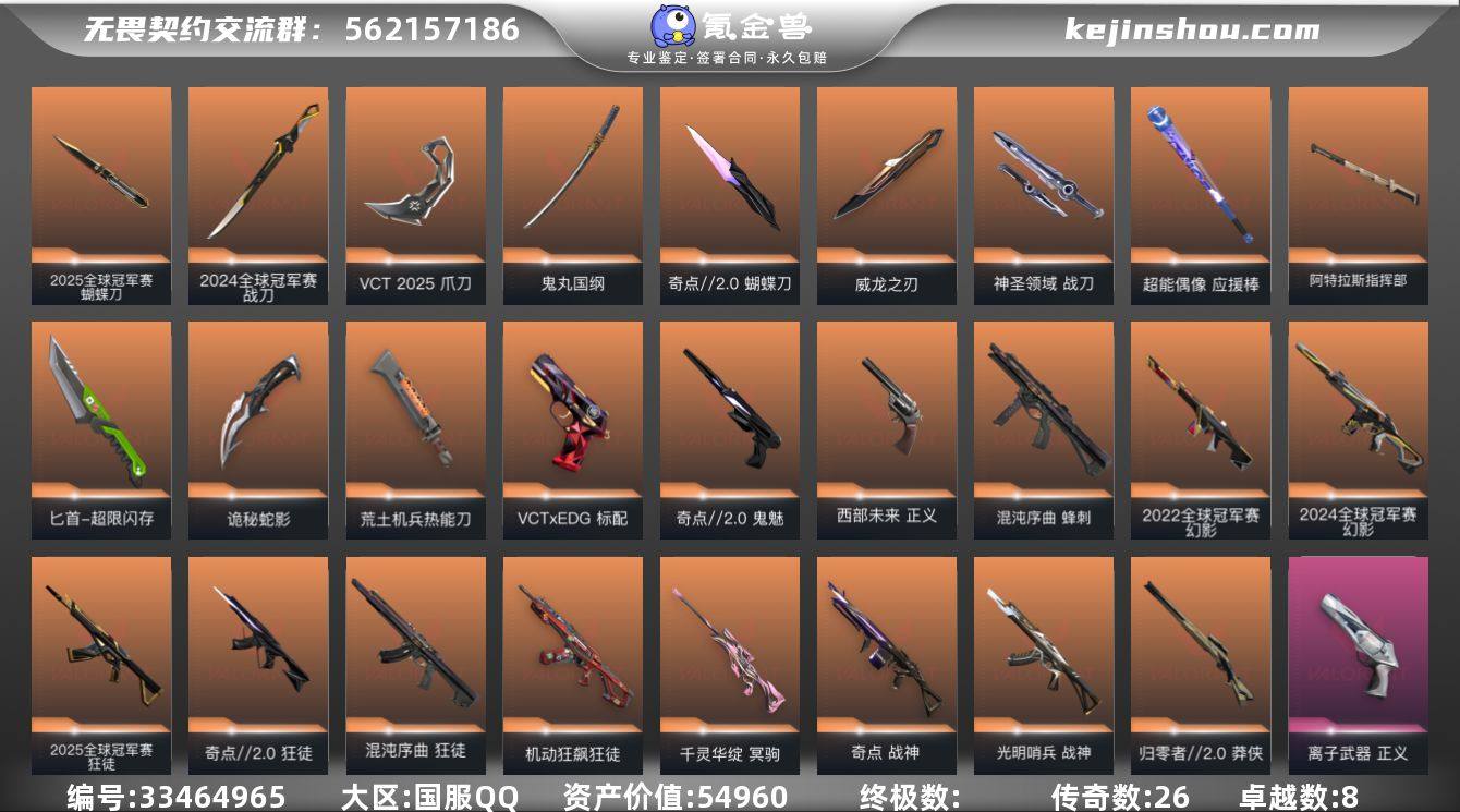 无畏契约高氪账号出售|VCT冠军典藏全收集 账号核心卖点 🔥 绝版冠军套全齐,赛场荣耀拉满 - 2025/2024全球冠军套装:双届完整冠军套全收录,2025冠军狂徒/冥驹、2024冠军狂徒/冥驹特效拉满,赛事收藏价值天花板; - 2022全球冠军M4:经典赛事皮肤,稀有度拉满,弹道手感适配度极高,老玩家必备; - VCT 2025爪刀:无畏契约顶级赛事联名款,刀身质感与特效拉满,行走间尽显大佬身份,账号稀缺身份象征。 ✨ 顶配限定,全枪无短板 - 2024 EDG标配:战队联名限定款,收藏与手感双在线; - 皮肤资产价值超5.4万,拥有106款皮肤,涵盖掠影系列、堕天遗武、紫阙金琅、奇点2.0等爆款全系列; - 鬼丸国纲、威龙之刃等特效刀全覆盖,不管竞技还是休闲,颜值与手感同步拉满。 账号基础信息 游戏等级Lv179,游戏时长798h,赛季KDA 1.35,入手即享全服顶级账号体验,省去漫长氪金收集路,绝版皮肤+顶级配置,诚意出售,白天在线 可小刀