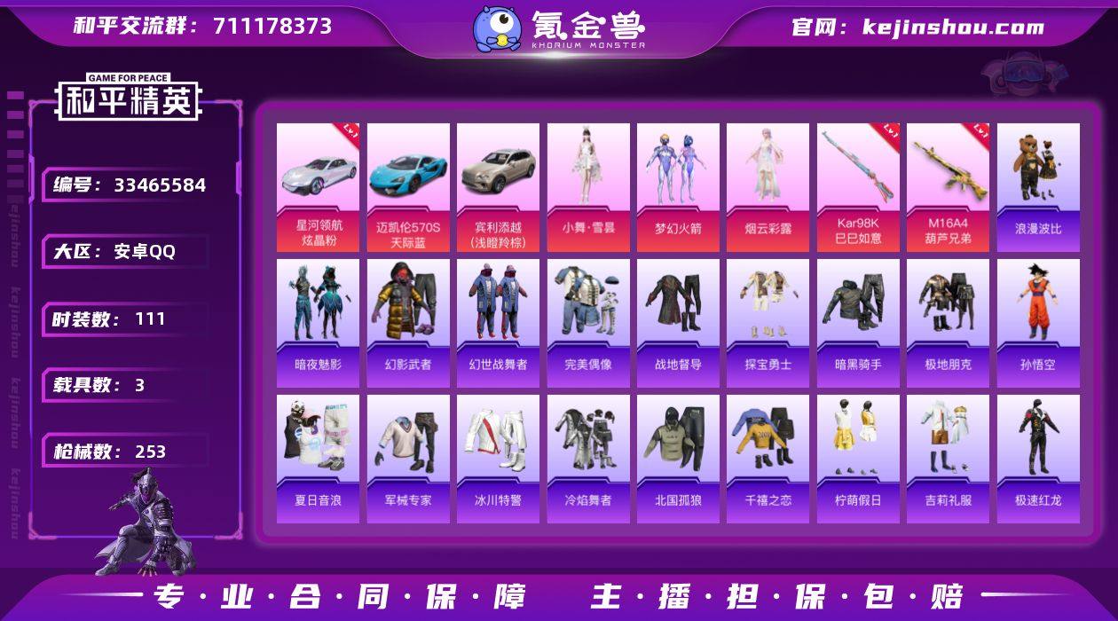 HM6893安卓Q区-3载具1僚机-5粉装-6特效枪-2级载具星河领航-87196热力值-3王牌印记-208套装-253枪皮【优质套装】: 梦幻火箭 人物-小舞·雪昙 鸢尾珑雾 幻彩电音 烟云彩露【优质载具皮肤】 星河领航(炫晶粉) 宾利添越(浅瞪羚棕) 迈凯伦570S(天际蓝)【特效枪等级】:Kar98K-巳巳如意(五级- Kar98K-巳巳如意)M16A4-葫芦兄弟(四级- M16A4-葫芦兄弟)【优质武器皮肤】: Kar98K-巳巳如意 M16A4-葫芦兄弟【稀有武器皮肤】: DBS-乌木金纹 AMR-墨龙九天 DBS-创世·救赎 S1897-精灵梦叶罗丽 SCAR-L-海盐豹豹 GROZA-海盐豹豹 Kar98K-巳巳如意 野牛-雏菊兔兔 平底锅-雏菊兔兔 M762-雏菊兔兔 Mini14-雏菊兔兔 R1895-雏菊兔兔 20-H-乌木金纹 M16A4-葫芦兄弟 蜜獾-乌木金纹 M416-红色方程式 M416-仓鼠灰灰 M416-乌木金纹 M416-蓝色火焰 M416-糯团青竹 M416-绯红前夜 AKM-筑梦精灵 AKM-彩虹符号 AKM-破晓战魂 AKM-龙的传人 AKM-灼热熔岩 AKM-虎虎生威 AKM-萌趣颜团子 SCAR-L-红色方程式 SCAR-L-玉兔迎春 SCAR-L-乌木金纹 SCAR-L-炫彩节奏 M16A4-红色方程式 M16A4-蓝色火焰 M16A4-幻世战舞者 M16A4-生命誓言 GROZA-异彩先驱 GROZA-彩虹符号 GROZA-治愈之星 AUG-耀粉歌者 AUG-青春冒险家 AUG-焰龙...