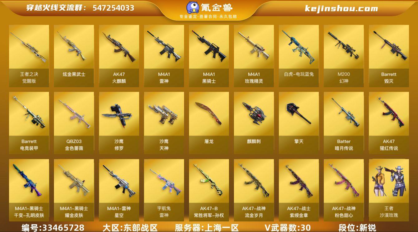上海一区-33V-1王者武器数-1炫金武器数 【热门武器】:QBZ03-金色蔷薇,M200-幻神,白虎-电玩蓝兔,M4A1-黑骑士,沙鹰-修罗 【王者炫金武器】:炫金武士 【音效卡】:M4A1-黑骑士音效卡,QBZ03-金色蔷薇音效卡,70KG语音包 【皮肤】:雷神-星空,雷神-冠军之魄,雷神-宇航兔皮肤,M4A1-千变-孔明皮肤,黑骑士耀金皮肤,战神-粉色甜心皮肤,战神-紫绶金章皮肤,战神-流金岁月皮肤,AK47-B-常胜将军-孙权*2 【角色】:雨棠,王者沙漠玫瑰,灵狐者-七夕宝贝,潘多拉-X,兔囡囡 【人偶武器】:黄金迷你深渊冰龙,迷你超能女侍 【暴走生化】:超级对讲机 【挑战大师】:冰龙粉碎者-白马银枪 【英雄级武器】:AK47-火麒麟,M4A1-雷神,M4A1-黑骑士,QBZ03-金色蔷薇,M4A1-玫瑰精灵,AK-47-猩红传说*3,白虎-电玩蓝兔,Barrett-毁灭,M200-幻神,Barrett-电竞装甲,王者之决-觉醒版,Barrett-暗月传说*2,沙鹰-修罗,沙鹰-天神,屠龙,擎天,麒麟刺 【其他武器】:源·火麒麟,源·雷神,魂-雷神-萌杀,御·雷神-机甲刑天,御·雷神-烈虎*2,魂·黑骑士-现代金属*2,源·武圣,源·机械迷城,魂·龙血-锋芒破茧,源·天龙,魂·裁决-新人王绿豆,魂·毁灭-青帝,魂·炼狱-玩具枪,御·炼狱-女娲,...
