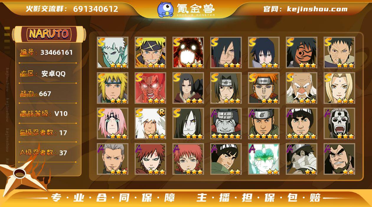 可免费转苹果 V10 667万战力 17S-37A 九喇嘛水门76片 TT1910 【S级忍者】:宇智波鼬「秽土转生」(3星),宇智波斑「秽土转生·解」(3星),大野木「忍界大战」(3星),春野樱「忍界大战」(3星),宇智波带土「忍界大战」(3星),宇智波鼬「须佐能乎」(3星),自来也「舞之豪杰」(3星),大蛇丸(3星),纲手(3星),波风水门(3星),神秘面具男「红夜之刃」(3星),迈特凯「死门」(3星),佩恩「天道」(3星),宇智波佐助「永恒万花筒」(3星),漩涡鸣人「暴怒·第六尾」(3星),漩涡鸣人·宇智波佐助(3星),宇智波带土「十尾人柱力」(3星) 【A级忍者】:艾「青年」(2星),长门「青年」(2星),波风水门「青年」(2星),迪达拉「新春限定」(2星),迪达拉「秽土转生」(2星),迪达拉「晓创生」(2星),大蛇丸「晓」(2星),奇拉比「忍界大战」(2星),飞段(3星),飞段「死司凭血」(3星),干柿鬼鲛(5星),漩涡博人「桃式显现」(2星),漩涡鸣人「九尾查克拉」(2星),迈特凯(5星),桃地再不斩「秽土转生」(2星),我爱罗「疾风传」(3星),蝎(3星),小南「神驹佑将」(2星),猿飞阿斯玛(5星),猿飞阿斯玛「秽土转生」(2星),宇智波佐助「须佐能乎」(2星),药师兜「侠隐江湖」(2星),照美冥「五代目水影」(2星)...