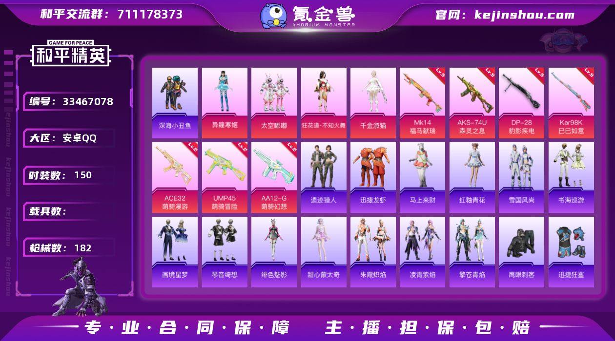 安卓 手Q-5粉装-7特效枪-0载具-2粉色飞行器-57428热力值-9王牌印记-150套装-182枪皮 【热门品类】:套装-深海小丑鱼,套装-龟仙人 【粉色套装】:粉装-太空嘟嘟,角色-狂花道·不知火舞,角色-千金淑猫,角色-异瞳寒姬 【粉色枪皮等级】:ACE32-萌骑漫游(二级),UMP45-萌骑冒险(二级),AKS-74U-森灵之息(五级),Kar98K-巳巳如意(五级),Mk14-福马献瑞(五级),AA12-G-萌骑幻想(二级),DP-28-豹影疾电(五级) 【粉色枪皮】:ACE32-萌骑漫游,UMP45-萌骑冒险,AKS-74U-森灵之息,Kar98K-巳巳如意,Mk14-福马献瑞,AA12-G-萌骑幻想,DP-28-豹影疾电 【粉色飞行器】:炫彩糖果飞行器,无垠阁飞行器 【粉色降落伞】:绝对恒星降落伞,洛神天依降落伞,彩虹甜喵降落伞,蜜语绒猫降落伞,星空武士降落伞,桃粉嫣然降落伞,幻彩电音降落伞,异瞳寒姬降落伞,极意拳锋降落伞,炫彩糖果降落伞 【稀有套装】:套装-龟仙人,套装-巳巳如意,角色-甜心蒙太奇,套装-雪国风尚,套装-炫彩糖果,套装-马上来财,套装-迅捷龙虾,套装-遗迹猎人,套装-雏菊兔兔,套装-萝兰蝴蝶,套装-小熊娃娃,套装-糖糖葫芦,套装-青团波波,套装-棉花软糖,角色-都市丽猫,角色-光矢逐梦,套装-燕燕于飞,套装-鱼...