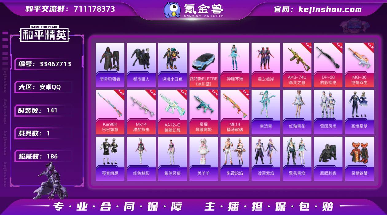 【kyhp1978】安卓 手Q-2粉装-8特效枪-1载具-1粉色飞行器-52281热力值-2王牌印记-141套装-186枪皮 【热门品类】:套装-都市猎人,套装-深海小丑鱼,套装-小丑鱼,套装-奇异狩猎者,套装-龟仙人,套装-粉红小猪 【粉色套装】:粉装-星之彼岸,角色-异瞳寒姬 【粉色枪皮等级】:蜜獾-异瞳寒姬(四级),AKS-74U-森灵之息(五级),Kar98K-巳巳如意(五级),Mk14-甜梦熊击(五级),Mk14-福马献瑞(三级),AA12-G-萌骑幻想(四级),DP-28-豹影疾电(五级),MG-36-沧焰双生(五级) 【粉色载具】:路特斯ELETRE(冰川蓝) 【粉色枪皮】:蜜獾-异瞳寒姬,AKS-74U-森灵之息,Kar98K-巳巳如意,Mk14-甜梦熊击,Mk14-福马献瑞,AA12-G-萌骑幻想,DP-28-豹影疾电,MG-36-沧焰双生 【粉色飞行器】:炫彩糖果飞行器 【粉色降落伞】:香水柠檬降落伞,炙焰牛王降落伞,精灵梦叶罗丽降落伞,幻彩电音降落伞,喜羊羊与灰太狼降落伞,异瞳寒姬降落伞,炫彩糖果降落伞,镜花水月降落伞 【稀有套装】:套装-龟仙人,套装-巳巳如意,套装-雪国风尚,套装-炫彩糖果,角色-幸运青,套装-新风雅兰,套装-紫幽梦,套装-蓝冰羽,套装-霓虹热舞,套装-云朵鹅,套装-雪绒豹,角色-绛羽幽主,套装-朱霞炽焰,套装-凌霄...