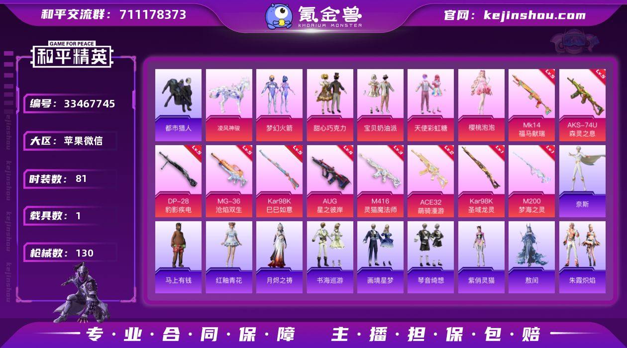 【ZHP858】5粉9枪1载具巧克力三姐妹新101樱桃泡泡都市猎人!苹果 微信-5粉装-10特效枪-1载具-8粉色飞行器-37766热力值-2王牌印记-81套装-130枪皮 【热门品类】:粉装-梦幻火箭,套装-浪漫天命,套装-都市猎人,套装-小丑鱼,套装-暗影哥特,熔岩游骑兵连帽夹克 【粉色套装】:粉装-甜心巧克力,粉装-宝贝奶油派,粉装-天使彩虹糖,粉装-梦幻火箭,角色-樱桃泡泡 【粉色枪皮等级】:M416-灵猫魔法师(三级),AUG-星之彼岸(四级),ACE32-萌骑漫游(二级),AKS-74U-森灵之息(五级),Kar98K-巳巳如意(五级),Kar98K-圣域龙灵(一级),Mk14-福马献瑞(五级),M200-梦海之灵(一级),DP-28-豹影疾电(五级),MG-36-沧焰双生(五级) 【粉色载具】:凌风神骏 【粉色枪皮】:M416-灵猫魔法师,AUG-星之彼岸,ACE32-萌骑漫游,AKS-74U-森灵之息,Kar98K-巳巳如意,Kar98K-圣域龙灵,Mk14-福马献瑞,M200-梦海之灵,DP-28-豹影疾电,MG-36-沧焰双生 【粉色飞行器】:香车宝马飞行器,星之彼岸飞行器,沙丘之主天马,幻海精灵飞行器,圣域金龙飞行器,终晖之翼飞行器,云梦轻舟飞行器 【粉色降落伞】:甜心宝贝降落伞,梦幻火箭降落伞,星之彼岸降落伞,镜光幻境降落伞,幻影飞狐降落伞,樱桃泡泡...