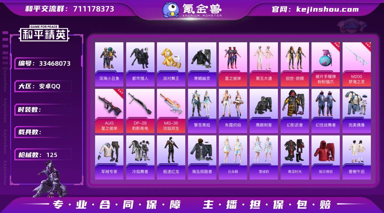 【寒蝎 都市 金鞋 第五大道 双马尾 满地铁天赋】c29868-【无二次协助处理】【因赛季更新游戏段付以上号为准!】 安卓Q-5稀有4粉装9特效枪6热门76套装125枪皮 3印记 历史超级王牌9星 【5稀有】 寒蝎幽灵 都市猎人 浪漫天命 派对舞王 派对舞王(金靴子) 【4粉装】 创世救赎 霁蓝缠春 第五大道 星之彼岸 【9特效枪】 AKS-74U-森灵之息 (5级) MG-36-沧焰双生 (5级) DP-28-豹影疾电 (5级) M200-梦海之灵 (3级) AUG-星之彼岸 (6级) Mk14-福马献瑞 (5级) AA12-G-萌骑幻想 (3级) 燃烧瓶-薄荷可可 (6级) 破片手榴弹-粉粉猫爪 (7级) 【6热门】 晶辉守护 鹰眼刺客 深海小丑鱼 JDE战队服 极速红龙 弄潮海豚 【1飞行器】 幻海精灵飞行器 【1背包】 甜心宝贝背包