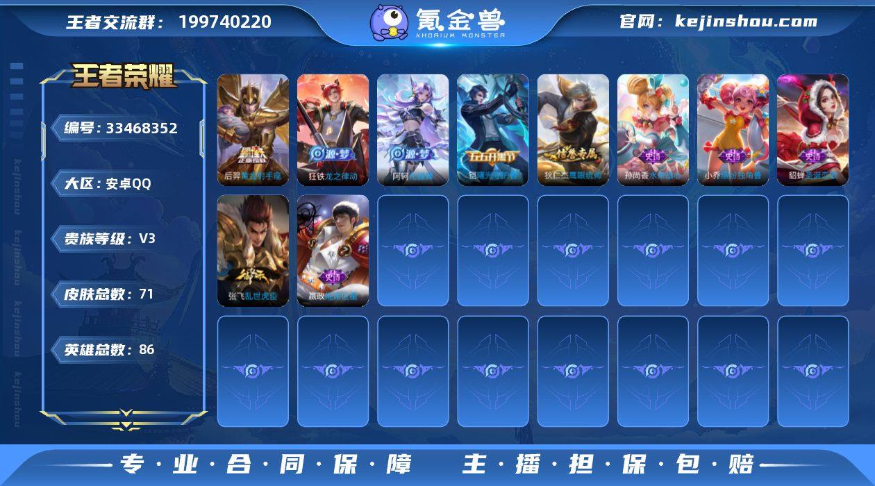 V3 2传说 86英雄 71皮肤 不可修改实名 女号