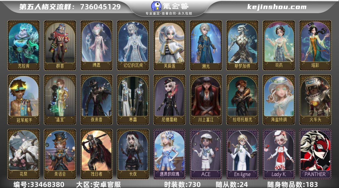 守夜人蚀日者,有服部平次skull,毛利小五郎,KF C联动两个都有,芙莉莲金皮,阿乌拉,富江锁芯,小女孩瑞吉尔,滚滚伙伴,冬,美少年和双一还有高卷杏觉醒,女王蜂限定金,医生司药,溯光,心理学家长夜挂件有兔美美加盒子。本人大学生,这个号玩了好多年了是b牌前锋,c牌野人最高段位上过双六阶