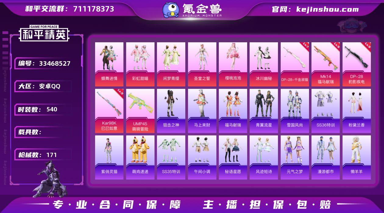 实名: 可修改 时装数: 540 枪械数: 171 热门装扮: 蝶舞迷情,彩虹甜喵,冰川幽秘,闲梦青缨,圣堂之誓,樱桃泡泡 稀有枪皮: DP-28-千金淑猫,Kar98K-巳巳如意,DP-28-豹影疾电,MK14-福马献瑞,UMP45-萌骑冒险 亮点: 【优质装备】:七级DP-28-千金淑猫