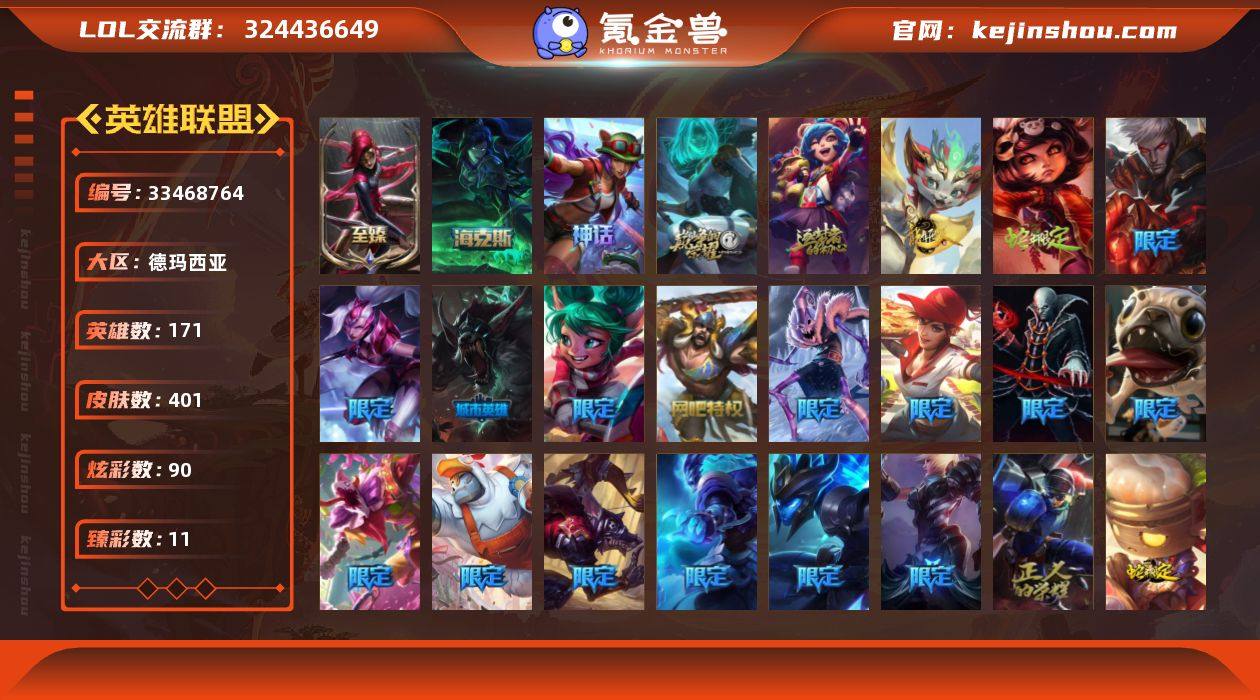 【LSA1491】171英雄/401皮肤/6神话/51限定/11臻彩/90炫彩/28传说/95史诗/未定级账号等级:940/觅心之翼奎因/10周年 安妮/源代码 乐芙兰/十五周年纪念 希维尔/10周年庆典 凤凰/至臻 黑色玫瑰假面舞会 卡特琳娜/摄魂 薇恩/天龙之子 卡莎 飞龙乘云/无畏骑士 瑟庄妮 赤子初心/征服者 韦鲁斯 炫金/源计划: 毁灭 派克 幻灭/西部魔影 卢锡安 贝利尔之怠/女帝 卡特琳娜 纹章之刻印 英勇/幻灵战斗猫 金克丝 梦幻强袭/可爱可爱粉红红 布里茨/幻灵战斗队长 厄运小姐 勇气赞歌/魔女 阿卡丽 虚荣/净雪之月 莫甘娜 冬虹/“你看见过我的熊猫吗?” 安妮/天龙之子 斯莫德/点心宝贝 阿木木/水晶玫瑰 斯维因/圣诞精灵 崔丝塔娜/圣诞狂欢 努努/圣诞狂欢 时光/胡桃夹子 小丑/英勇玩具兵船长/冰雪节 茂凯/雪球也能爆炸 吉格斯/诺斯费拉图 弗拉基米尔/送披萨的小姐姐 希维尔/冠军典狱长 锤石/冠军之矛 卡莉丝塔/冠军之刃 锐雯 2016/S1FNC 酒桶/S1FNC 库奇/S2 暗杀星 发条/S2 暗杀星 蒙多/S2 暗杀星 慎/S3 SKT T1 婕拉/S4 SSW 炼金/S5 SKT T1 蜘蛛/6周年 伊泽瑞尔/暗裔英雄 盖伦/胜利之树 茂凯/胜利枪神 格雷福斯/胜利女神 奥莉安娜/胜利之剑 亚托克斯/胜利枪神 卢锡安/胜利女神 瑟庄妮/胜利凤凰 艾尼维...