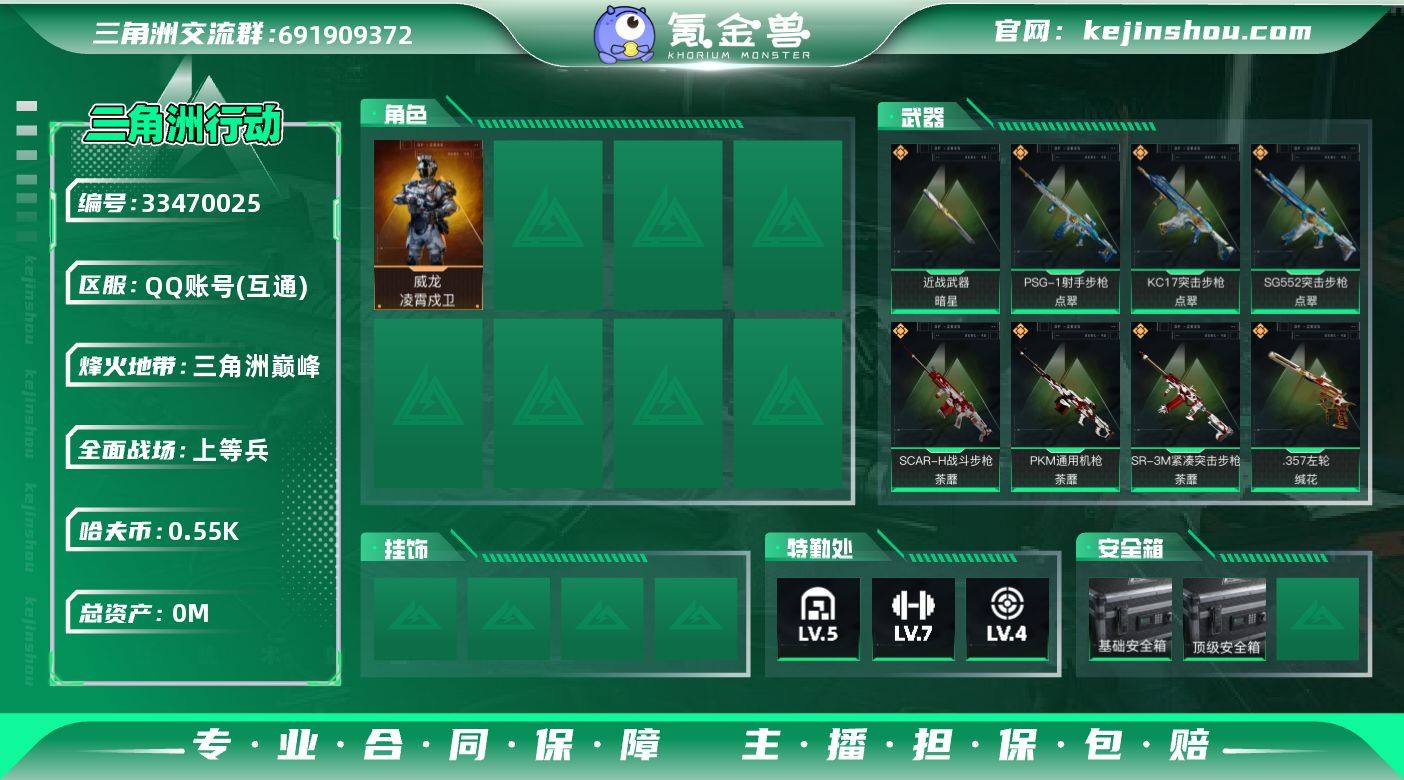 实名: 不可修改 烽火地带段位: 三角洲巅峰 全面战场段位: 上等兵 总资产: 12 哈夫币: 559 干员外观: 威龙-凌霄戍卫 传说武器皮肤: 近战-暗星,MK47突击步枪-暗星,SR-3M紧凑突击步枪-暗星,M14射手步枪-蛮荒,QBZ95-1突击步枪-凌霄戍卫,SCAR-H战斗步枪-荼蘼,PKM通用机枪-荼蘼,SR-3M紧凑突击步枪-荼蘼,.357左轮-缄花,SMG-45冲锋枪-锦绣,K437突击步枪-锦绣,AKM突击步枪-锦绣,KC17突击步枪-点翠,PSG-1射手步枪-点翠,SG552突击步枪-点翠
