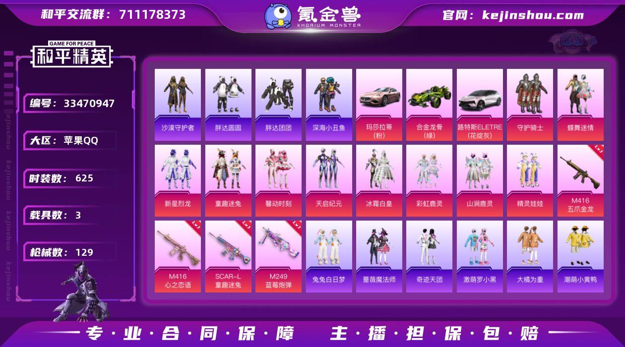 10粉装 5特效枪 3载具 1印记 可二次 可修改实名 【热门装扮】守护骑士,蝶舞迷情,新星烈龙(小白龙),童趣迷兔,馨动时刻,天启纪元,冰霜白皇,彩虹鹿灵,山涧鹿灵,精灵娃娃,沙漠守护者,兔兔白日梦,蔷薇魔法师,奇迹天团,胖达圆圆,胖达团团,激萌罗小黑,大橘为重,潮萌小黄鸭,恒星战甲,迅捷狂鲨,呆萌铁蟹,深海小丑鱼,浪漫波比 【载具】玛莎拉蒂Ghibli(粉),合金龙骨(绿),路特斯ELETRE(花绽灰) 【稀有枪皮】Kar98K-巳巳如意,M416五爪金龙,M416心之恋语,SCAR-L童趣迷兔,M249蓝莓炮弹 【六级特效枪】六级M416-心之恋语 【五级特效枪】五级SCAR-L-童趣迷兔,五级M249-蓝莓炮弹 【二级特效枪】二级M416-五爪金龙 【一级特效枪】一级Kar98K-巳巳如意 【紫色装扮】战地菁英,格斗先锋,沙漠探路者,沙漠兵团,攀登者,极地朋克,探宝勇士,凛冬战士,北国孤狼,千禧之恋,午夜朋克,和平特警,圣诞大吉,夏日倾情,夏日音浪,夜莺强袭者,完美偶像,帅气教官,幻世战舞者,怒火燎原,战地名士,深蓝色名流,派对绅士,甜蜜告白,甜蜜菠萝,疯狂小兔子,白熊同盟,神秘领域,空投萌叽,竞技勇士朋克,竞技达人朋克,狂沙舞者,狂战萌兔,灰色格斗者,海滨突袭者,湖蓝色名流,滨海假日,滨海厨神,潮流炫酷,炫蓝之夏,牛气满满,特战装甲...