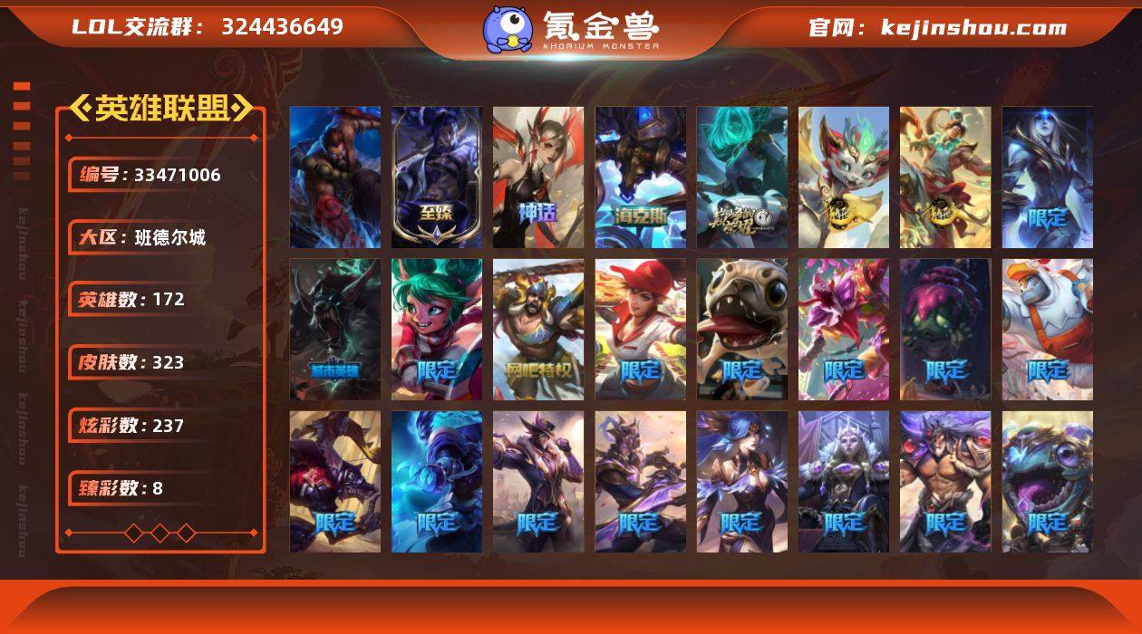【LOLZ1481】172英雄/323皮肤/1终极/5神话/47限定/8臻彩/237炫彩/23传说/78史诗/白银账号等级:837/觅心之翼奎因/源代码 乐芙兰/殿堂传奇 乐芙兰/10周年庆典 凤凰/至臻 墨之影武者 亚索/海克斯 阿利斯塔/冰霜之刃 艾瑞莉娅 炫金/西部天使 赛娜 贝利尔之怠/星之吞噬者 莫甘娜 热情之末/霸天异形 卡兹克 刹那银光/殿堂传奇 乐芙兰 登神/星之守护者 阿卡丽 热情之光/魔女 阿卡丽 虚荣/净雪之月 莫甘娜 冬虹/天龙之子 李青/天龙之子 斯莫德/圣诞开心鬼 提莫/圣诞精灵 崔丝塔娜/胡桃夹子 小丑/英勇玩具兵船长/圣诞玩偶 波比/圣诞老人 酒桶/雪球也能爆炸 吉格斯/冰雪节 格雷福斯/灵魂守卫/送披萨的小姐姐 希维尔/冠军典狱长 锤石/S1FNC 酒桶/S1FNC 迦娜/S1FNC 嘉文四世/S1FNC 卡尔萨斯/S1FNC 库奇/S3 SKT T1 贾克斯/S3 SKT T1 劫/S3 SKT T1 李青/S3 SKT T1 薇恩/S5 SKT T1 瑞兹/S6 SKT T1 球女/S9 FPX 锤石/S10 DWG 蕾欧娜/暗裔英雄 盖伦/胜利女神 瑟庄妮/胜利之王 泰达米尔/胜利巨口 克格莫/胜利女神 娑娜/胜利剑圣 易/胜利之运 崔斯特/胜利女神-菲奥娜/灵魂收割者 索拉卡/魅惑女巫 崔丝塔娜/泳池派对 塔里克/泳池派对 佐伊/暗影 沃里克/野兽猎人 泰达米尔/波比的巧克力工坊/都铎王...
