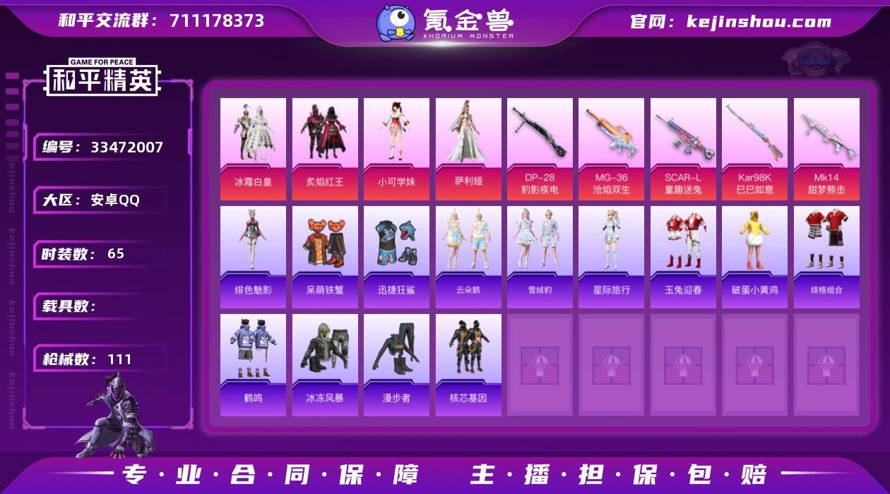 【957940】M1047375【身法号4粉装-9特效枪 小可学妹 深海小丑鱼 SCAR-L-童趣迷兔[6级]】无二次包 安卓手Q-4粉装-9特效枪-65套装-111枪皮-4王牌印记-不朽星钻Ⅴ-30572热力值【4粉装】角色-小可学妹,炙焰红王,角色-萨利娅,冰霜白皇【9特效枪】MG-36-沧焰双生[5级],Kar98K-巳巳如意[5级],Mk14-甜梦熊击[5级],DP-28-豹影疾电[5级],SCAR-L-童趣迷兔[6级],UMP45-萌骑冒险[4级],ACE32-萌骑漫游[4级],Mk14-福马献瑞[2级],AKS-74U-森灵之息[4级]【2稀有】深海小丑鱼,AKM-缤纷海【8飞行器】狂鲨锋刃飞行器,登顶巅峰飞行器,异域银装飞行器,破刃行动尾迹,炫彩糖果飞行器,鸡智如我飞行器,童趣迷兔飞行器,马上有福飞行器【2头盔】深海小丑鱼头盔,童趣迷兔头盔【161其它衣服和枪皮】酒红色名流,SS38特训,漫游都市,旭日情侣,萌鸡速递,街头潮人,雪绒豹,马上有钱,SS32特训,魅力单车,雪国风尚,雨过天青,黄色运动,冷酷挑战者,元素星魂,鹤鸣,街头风暴,SS35特训,SS34特训,狂鲨锋刃,角色-魂电,破蛋小黄鸡,角色-绯色魅影,角色-星际旅行,红釉青花,漫步者,风迹短诗,迅捷狂鲨,核芯基因,玉兔迎春,狙击之神,擎苍青焰,秘语星愿,SS36特训,香桃花海,海岛探路者,炫彩糖果,SS37特训,长空猛禽,元气之梦,恋语绒绒,云...