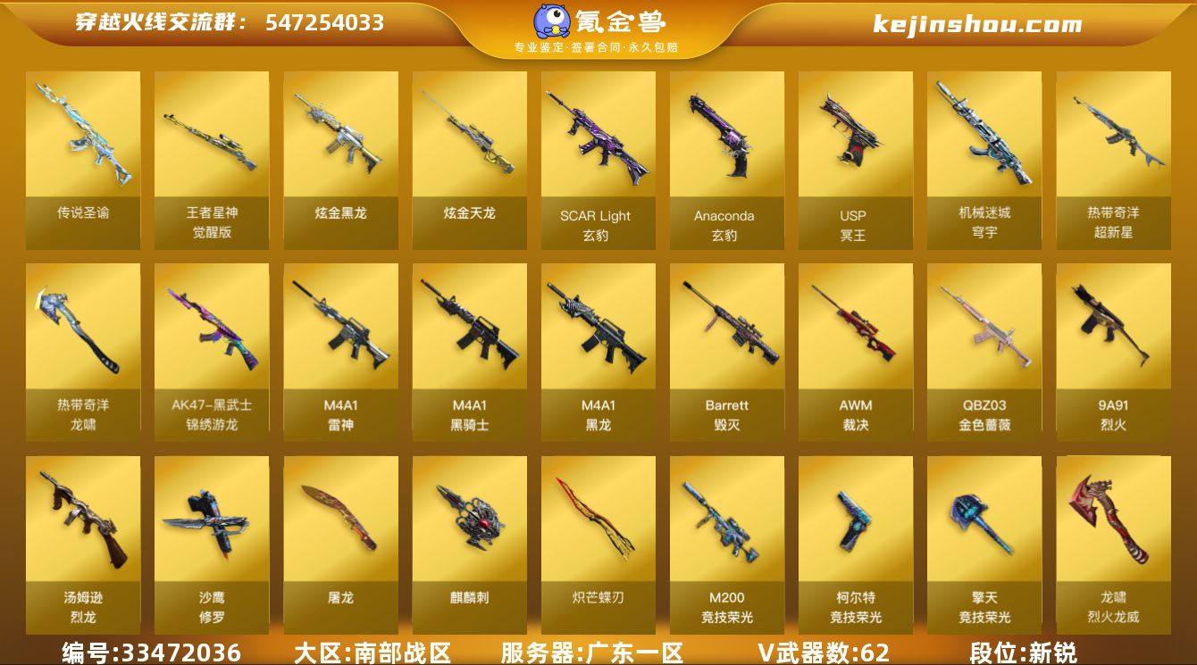 【ky6963】广东一区-62V-2王者武器数-2炫金武器数 【传说武器】:传说圣谕 【传说角色】:传说星骇 【热门武器】:传说圣谕,QBZ03-金色蔷薇,M200-竞技荣光,M4A1-黑骑士,汤姆逊-烈龙*6,羊驼玩偶,火麒麟-绝迹,沙鹰-修罗*2,炽芒蝶刃 【王者炫金武器】:王者冰锋,炫金黑龙,炫金天龙 【音效卡】:M4A1-黑骑士音效卡,AWM-裁决音效卡,Barrett-碧霄极光音效卡 【皮肤】:AWM-裁决-凤灵皮肤,裁决-叶芒苍灵 皮肤,雷神-暗月,雷神-能量核心,M4A1-雷神-新春神龙皮肤,雷神-诺拉 皮肤,毁灭-暗月,毁灭-黑大圣皮肤,黑龙-暗月,黑骑士-暗月,黑骑士-AG-S4冠军典藏,屠龙-巅峰荣耀 皮肤 【角色】:玄豹,零·纪元,王者空,奇洋探员,暗夜-X,初恋灵狐,飞虎队-X,风暴女,娟娟,猎狐者-追月,麻雀,曼陀罗-X,曼陀罗-礼服,萌儿,潘多拉-X,潘多拉-甜心教官,潜龙队-X,兔囡囡,维纳斯,夜玫瑰-宠粉,游珑儿 【人偶武器】:火麒麟-绝迹,异变清道夫-蛇影双骄,AWM-灵狐-15周年嘉年华,迷你波特博士,夺魂,深渊终结者手雷 【暴走生化】:超级对讲机 【挑战大师】:激光毁灭者III-白马银枪,激光毁灭者III,试炼破坏者III,神圣爆裂者-末日III 【英雄级武器】:M4A1-黑龙,M4A...