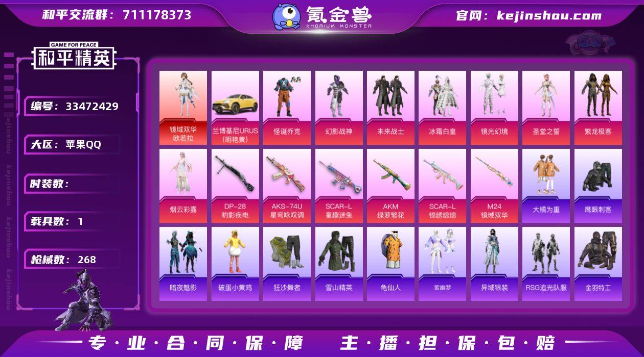 1载具-208套装-268枪皮-苹果手Q-男神号-地铁满天赋-小丑-3级红装欧若拉-RSG追光队服-未来战士-幻影主套-金羽-雪鹰学院-童趣头-蓝熊包-镜域双华滑翔尾迹-小丑鱼-街舞达人-冷酷挑战者-狂沙舞者-55天特权卡-72军需币-17王牌印记-1红装-8粉装-8特效枪-1载具-89888热力值-208套装-268枪皮-1卓越印记 【1红装】镜域双华-欧若拉/3级 【8粉装】套装-幻影战神,套装-繁龙极客,套装-未来战士,套装-怪诞乔克,角色-圣堂之誓,套装-镜光幻境,套装-冰霜白皇,角色-烟云彩露 【8特效枪】SCAR-L-锦绣绵绵/5级,DP-28-豹影疾电/4级,SCAR-L-童趣迷兔/6级,AKS-74U-星穹咏叹调/7级,AKM-绿萝繁花/5级,M24-镜域双华/3级,UMP45-萌骑冒险/4级,Mk14-福马献瑞/5级 【5稀有紫装】雪山精英,金羽特工,小丑鱼,龟仙人,暗夜魅影 【1稀有载具】兰博基尼URUS(明艳黄) 【207稀有时装】欧若拉/3级,怪诞乔克,圣堂之誓,繁龙极客,幻影战神,镜光幻境,冰霜白皇,未来战士,烟云彩露,RSG追光队服,迅捷龙虾,SS38特训,龟仙人,雪山精英,小丑鱼,金羽特工,大橘为重,狂沙舞者,Alan Walker,萌趣咩咩,海上生明月,龙魂突击队,异域银装,白糯汤圆,冰河战士,大橘大利,战术大师,粉恋花,午间小调,琴音绮想,画境星梦,星影赞美诗,朱霞炽焰,狂鲨...