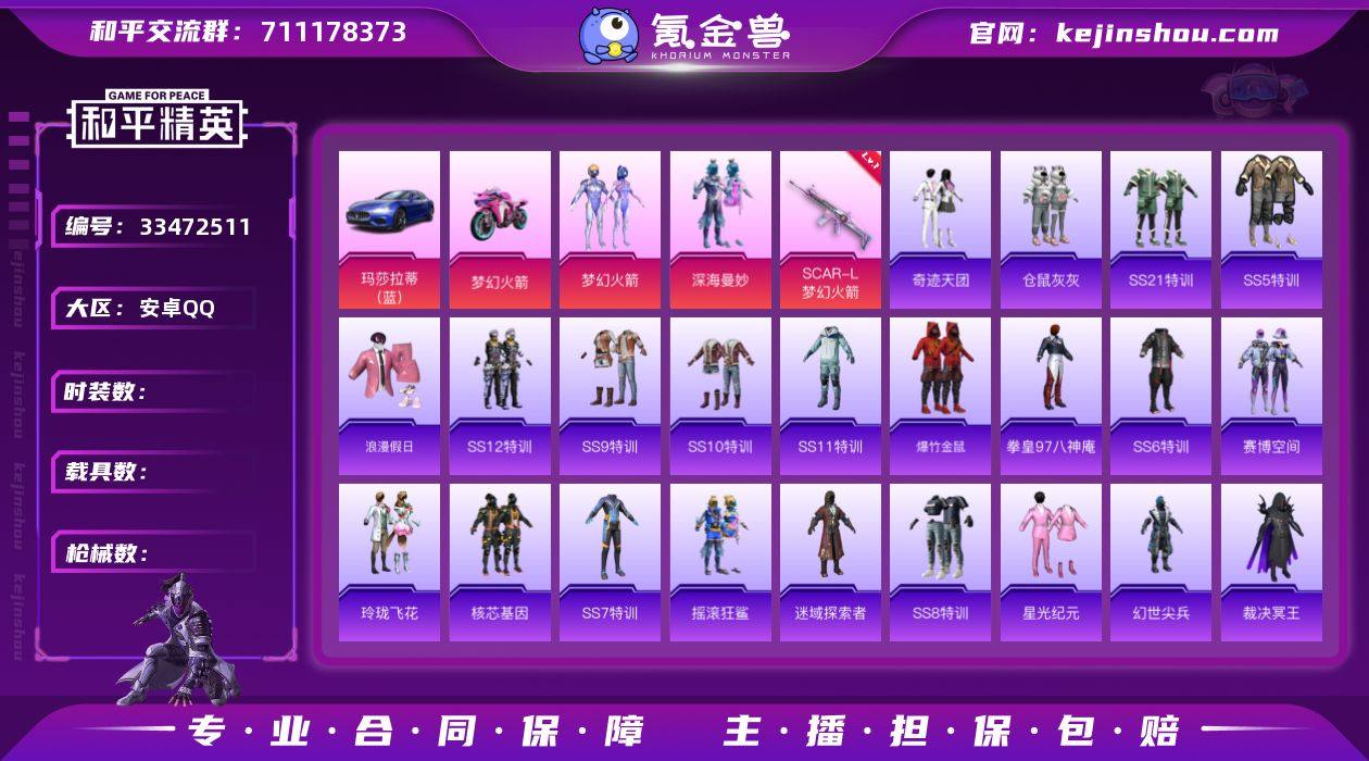 DSH2520有二次【2载具-2粉装-2特效枪梦幻火箭】安卓手Q-2载具-2粉装-2特效枪-66套装-75枪皮-3王牌印记-不朽星钻Ⅴ-26678热力值【2载具】玛莎拉蒂Ghibli(蓝),双人摩托-梦幻火箭【2粉装】深海曼妙,梦幻火箭【2特效枪】SCAR-L-梦幻火箭[4级],Mk14-福马献瑞[5级]【1稀有】裁决冥王【2飞行器】拳皇97滑翔尾迹,梦幻火箭飞行器【2头盔】仓鼠灰灰头盔,梦幻火箭头盔【5背包】金风玉露背包,仓鼠灰灰背包,梦幻火箭背包,金曜白虎背包,精灵迷巫背包【136其它衣服和枪皮】特训学院,格斗专家,荣耀,雪山征服者,传奇侦探,跃动心情,SS8特训,拳皇97八神庵,玲珑飞花,赛博空间,竞技勇士朋克,白色伏地魔,街头潮人,幻影武者,SS12特训,深蓝冒险家,疯狂小兔子,金鼠迎春,SS9特训,甜蜜告白,灰色格斗者,摇滚狂鲨,牛气满满,SS10特训,SS13特训,雨林探路者,甜蜜熊情侣,圣诞大吉,冰原使者,黑色伏地魔,耀动青春,SS5特训,星光纪元,怒火燎原,湖蓝色名流,千禧之恋,丛林猎人,仓鼠灰灰,北国孤狼,幻世尖兵,浪漫假日,蓝色运动,狙击之神,缤纷果语,精神漫游,福马献瑞,奇迹天团,雪山精英,沙漠兵团,SS36特训,凛冬战士,SS6特训,核芯基因,魅力单车,SS7特训,热血青春,爆竹金鼠,SS37特训,SS11特训,炽焰拳师,特殊使命,迷域探索者,...