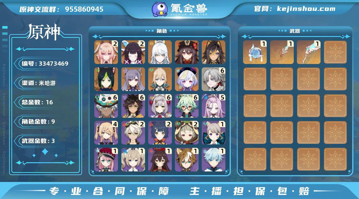 2+1哥伦比娅 2+0莉奈娅 0+0兹白 满命叶洛亚 完整月结晶 主线在须弥3.2 后面都没做 所有大型支线 从雪山开始都没做(包括各种书 清籁逐雷记 层岩巨渊深游记等等)充值双倍都拿过了 伤害太高 玩着无聊 等个有缘人