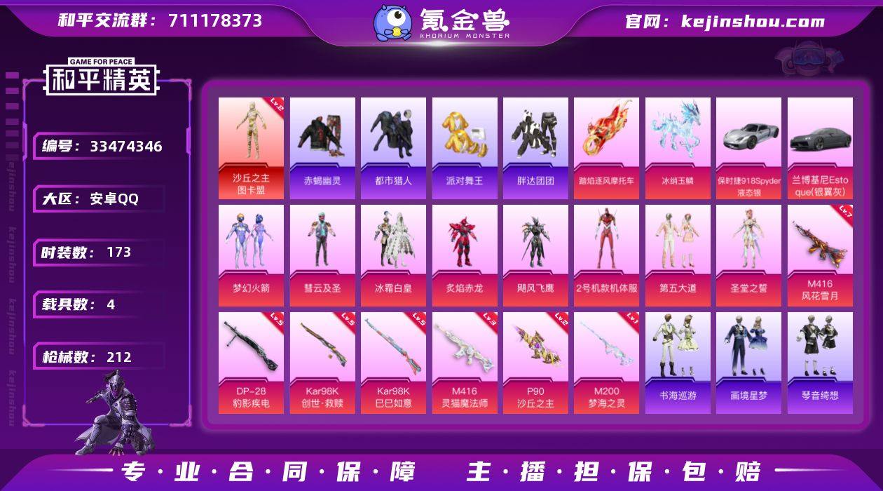 173套装/枪械9/装备240/载具4/战备145/王牌印记12/热力值73996/七级M416-风花雪月/三级M416-灵猫魔法师/一级ACE32-萌骑漫游/二级P90-沙丘之主/五级Kar98K-创世·救赎/五级Kar98K-巳巳如意/五级Mk14-福马献瑞/一级M200-梦海之灵/五级DP-28-豹影疾电/二级沙丘之主-图卡盟/沙丘之主-图卡盟/梦幻火箭(新101)/浪漫天命/赤蝎幽灵/都市猎人/派对舞王/小丑鱼/胖达团团/龟仙人/暗影哥特/彗云及圣/冰霜白皇/炙焰赤龙/飓风飞鹰/2号机款机体服/第五大道/圣堂之誓/兰博基尼Estoque(银翼灰)/保时捷918Spyder(液态银)/踏焰逐风摩托车/冰绡玉鳞/M416风花雪月/M416-灵猫魔法师/ACE32-萌骑漫游/P90沙丘之主/Kar98K创世·救赎/Kar98K-巳巳如意/Mk14-福马献瑞/M200梦海之灵/DP-28-豹影疾电/香车宝马飞行器/梦幻火箭飞行器/飞行器-圣光天使/沙丘之主天马飞行器/龙翔九天飞行器/幻海精灵飞行器/曦光华影飞行器/灵猫魔法师飞行器/飞天猪飞行器/梦幻火箭降落伞/星之彼岸降落伞/海渊国主降落伞/暗星紫秘降落伞/垂柳戏鸭降落伞/彩虹甜喵降落伞/音爆索尼克降落伞/第五大道降落伞/炫光之旅降落伞/江南烟雨降落伞/精灵梦叶罗丽降落伞/创世·救赎降落伞/魔童闹海 哪吒降落伞/炫彩糖果降落伞/巳巳如意/套装-马上...